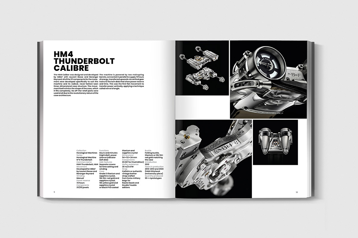 Come appunto anticipato nel titolo, MB&F: the First Fifteen Years racconta pezzo per pezzo l’intero catalogo dal 2005 al 2020. Scritto (in inglese) dalla giornalista Suzanne Wong e dal super-esperto William Massena, il coffetable blook è pubblicato dalle Editions de La Martinière e distribuito da Abrams. Nelle 30 pagine introduttive ripercorre la genesi del marchio creato da Max Büsser. Quindi documenta ogni singola “macchina orologiera”, inclusi prototipi e pezzi unici di cui sinora non s’era mai parlato. Comprende numeri di riferimento, specifiche tecniche, anni di produzione nonché la quantità esatta di ognuna delle 160 referenze prodotte. E descrive in dettaglio i 18 calibri sviluppati dal brand e dai suoi amici, sia per le Horological Machines che per le Legacy Machines. Il tutto illustrato da oltre 400 fotografie a colori.