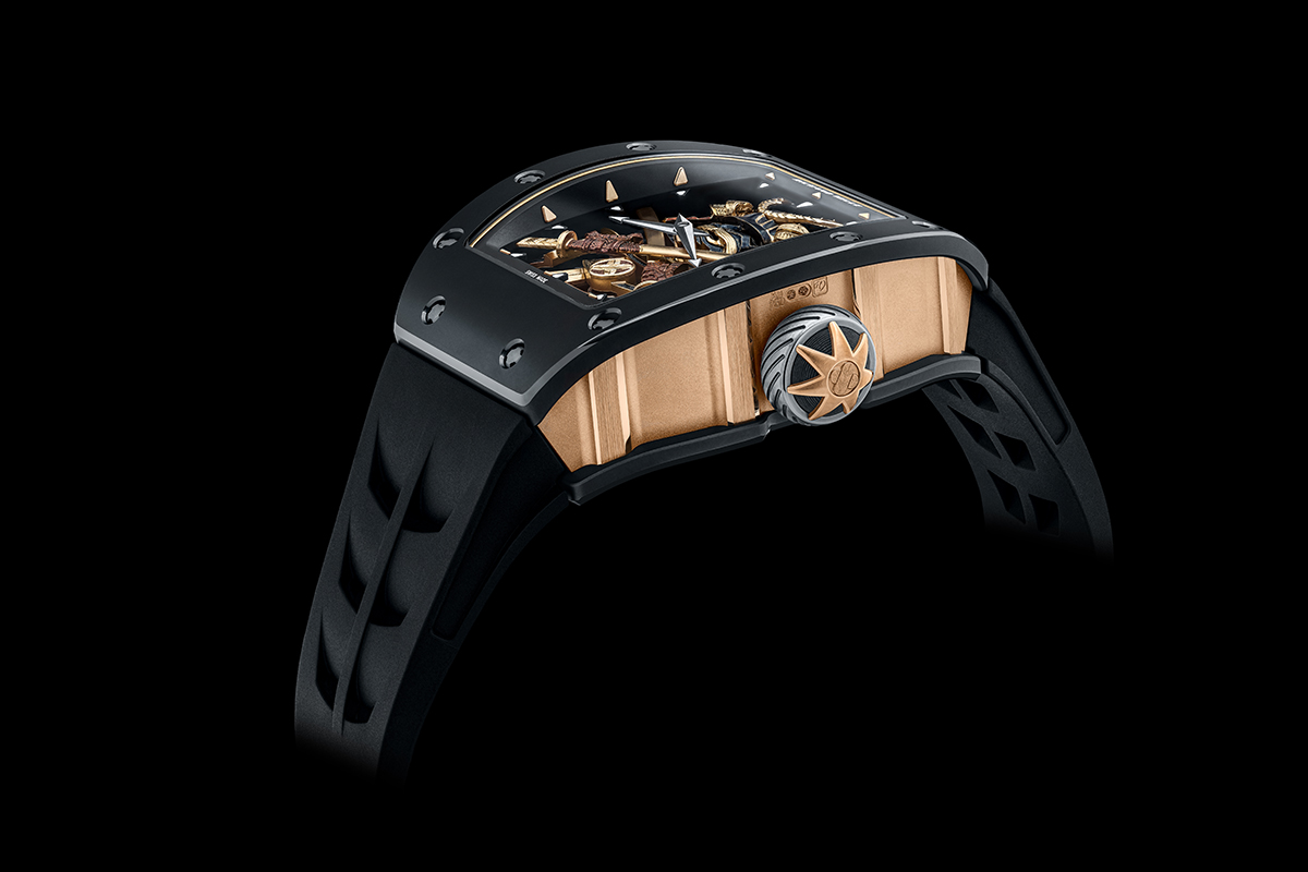 Non possono mancare infine le caratteristiche dell’orologio, la cui costruzione riflette l’approccio progettuale e realizzativo tipico di Richard Mille. A cominciare dalla cassa tonneau, che è composta da tre parti. La lunetta e il fondello sono realizzati in ceramica Tzp, composta al 95 per cento da zirconio stabilizzato con ittrio. Un materiale leggero ma resistente, praticamente inscalfibile dai graffi, dal tempo e dall’usura, che risulta ben tollerato anche dalle epidermidi più sensibili. La carrure invece è in oro 3N, una lega dal colore più caldo dell’oro giallo ma più tenue dell’oro rosso.