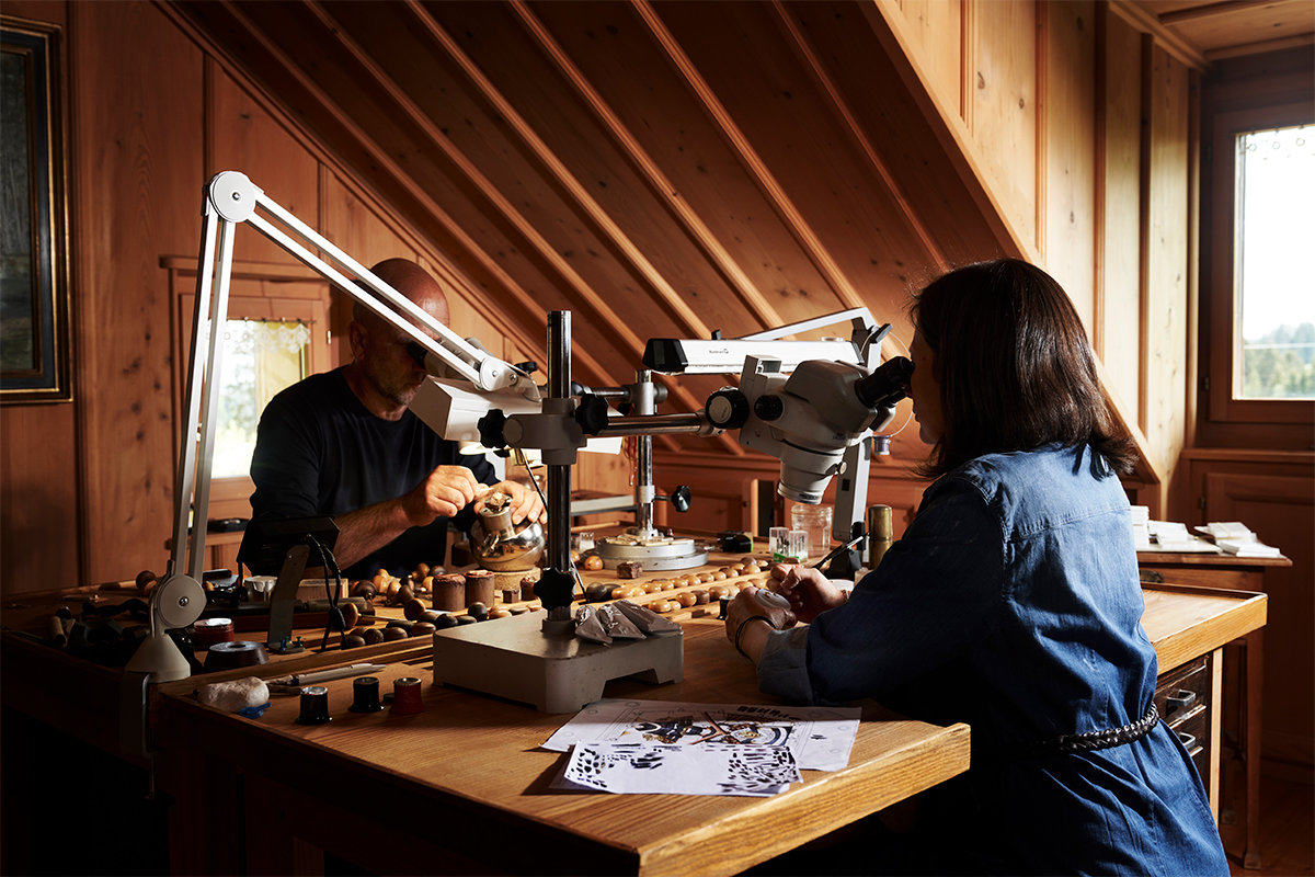 Un’opera di alto artigianato che ha richiesto più di un’intera giornata di lavoro: 16 ore di incisione e 9 di pittura, per la precisione. Nelle quali i due artisti si sono impegnati a fondo, e hanno attinto a tutto il proprio savoir-faire per realizzare quella che in un primo momento sembrava – sono parole loro – una mission impossible. Così, per esempio, Pierre-Alain Lozeron si è servito di una ventina di bulini diversi per creare i dettagli realistici del trompe-l’œil nella lastra d’oro. Mentre Valérie Lozeron ha dovuto non solo trovare la sfumatura più adatta a ciascun elemento attraverso la miscela di colori diversi; ma anche dosare la giusta quantità di smalto da applicare su una o due mani, e individuare la temperatura ideale per i successivi passaggi in forno.