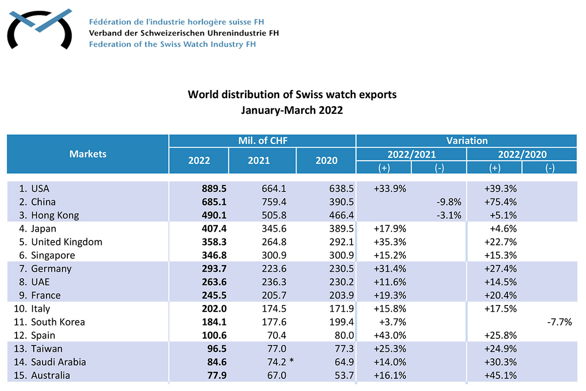 Ad osservare le esportazioni di orologi dalla Svizzera nel primo trimestre c’è da rimanere a bocca aperta. Eccezion fatta per pochissime nazioni, le cifre sono in aperta crescita, sia rispetto al 2020 sia rispetto al 2021. Seppure con qualche evidente problema da parte di Cina e Hong Kong, che sembrano tornate a combattere con i rallentamenti del Covid.