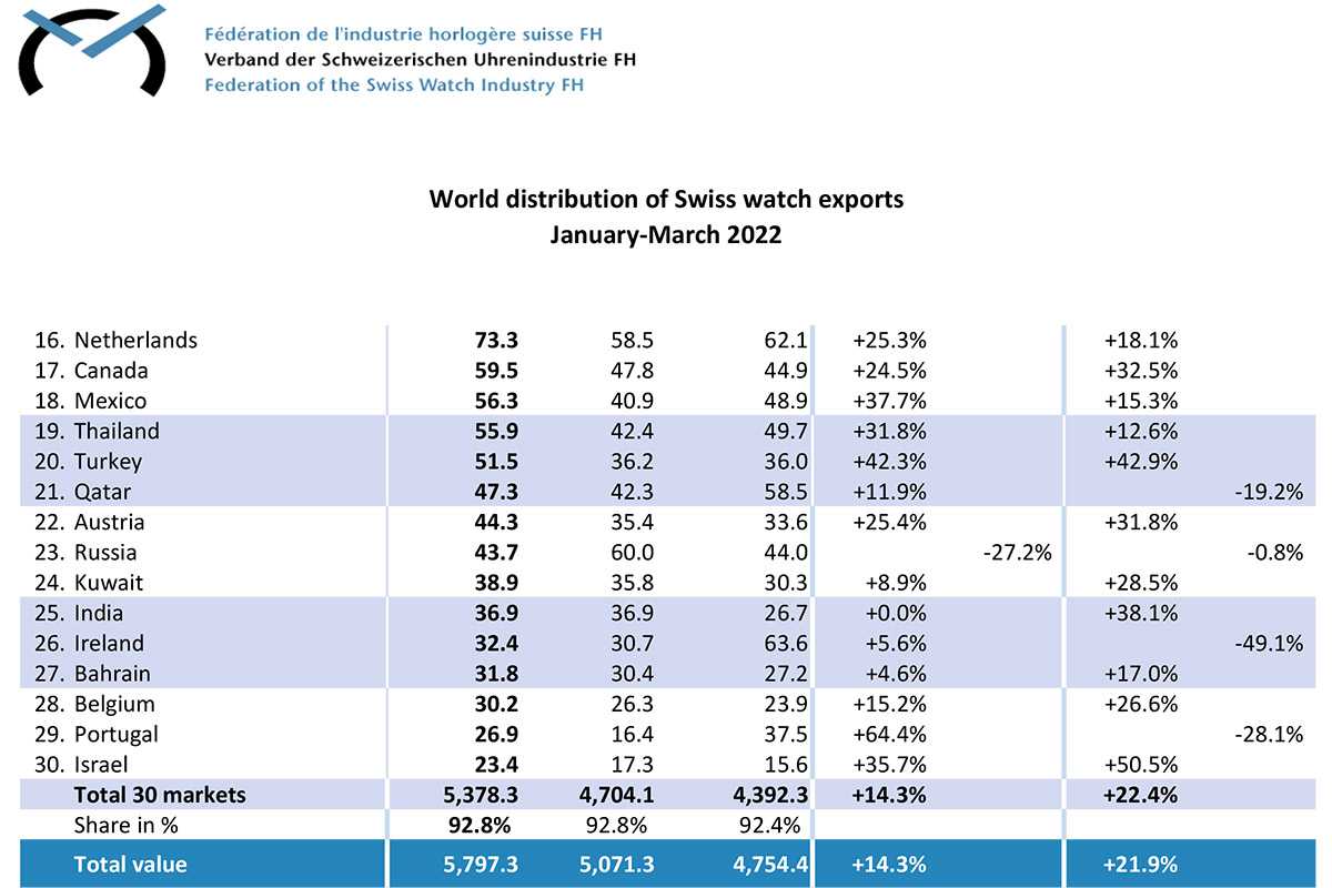 Il fatturato delle esportazioni fa registrare, nel periodo gennaio/marzo 2022, un aumento del 14,3%. Che è tanta roba. È interessante notare che già si registra un calo considerevole del mercato russo pari al 27,2%, ma questo calo è relativo ad un mercato ufficiale piuttosto poco consistente. Nella classifica dei maggiori Paesi importatori di orologi svizzeri, infatti, il mercato ufficiale russo si pone al 23° posto, fra Austria e Kuwait. In realtà i grandi compratori non risultano colpiti più di tanto dalle sanzioni e continuano ad acquistare orologi fuori dal proprio Paese, come hanno sempre fatto. Oppure tramite canali non ufficiali.