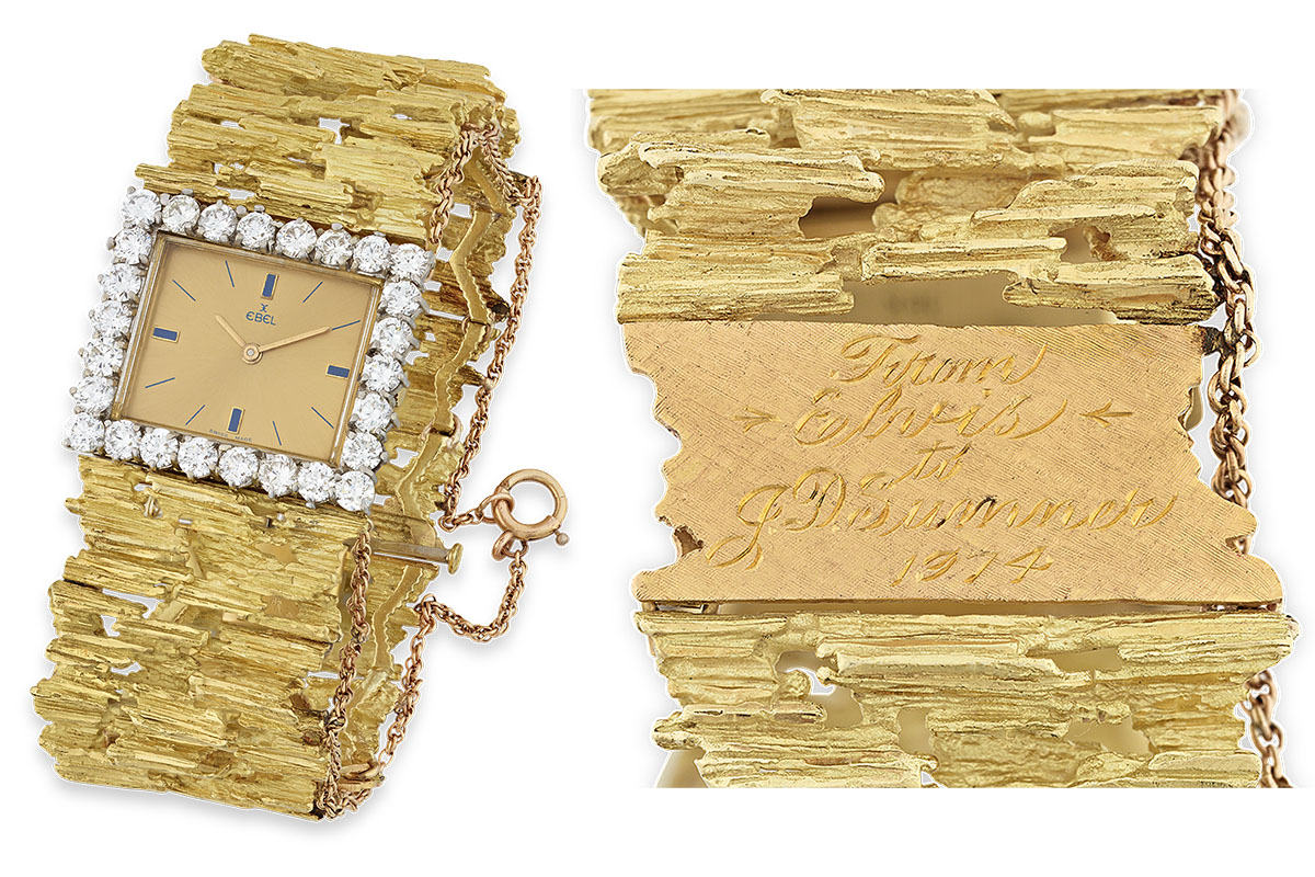 Una notizia recente, infine, riguarda un esemplare-gioiello realizzato da Ebel nei primi anni Settanta, dalla foggia particolare. Totalmente in oro giallo, con cassa carré, lunetta di diamanti e bracciale scultura, ben illustra lo stile sempre più eccentrico dell’artista. Che poi lo regalò all’amico e cantante gospel J.D. Sumner, facendogli incidere una dedica sul fondello. Acquistato dall’antiquario M.S. Rau per 495mila dollari, è entrato a far parte della sua collezione privata e conservato nella sua galleria di New Orleans.