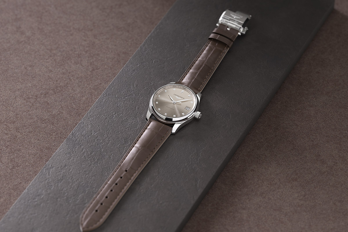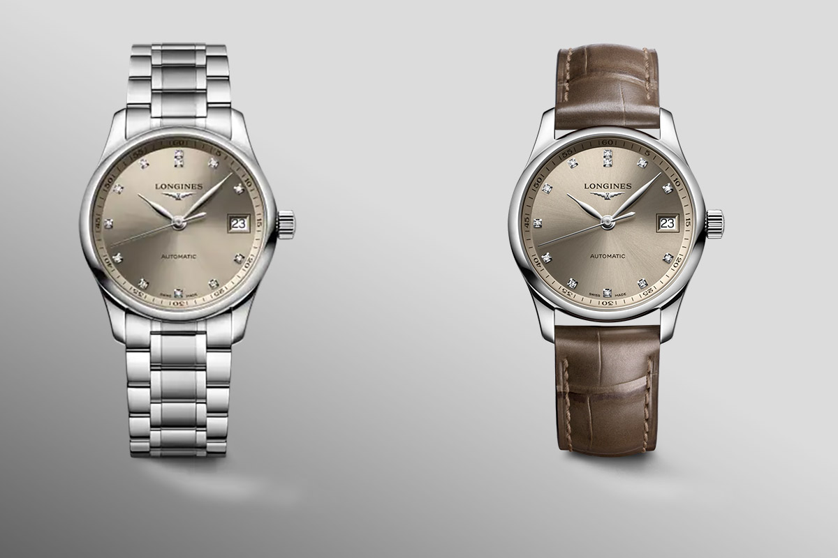 Due orologi dalle forme classiche ma con un twist contemporaneo: il quadrante che Longines chiama “color champagne”. Una tonalità particolare di beige, che sa un po’ di caffellatte un po’ di grigio sabbia, cui la lavorazione soleil dona riflessi ora più cupi ora più luminosi. Una sfumatura sofisticata e chic, inconsueta e scevra da qualsiasi implicazione modaiola, che si impreziosisce ulteriormente grazie agli indici di diamanti (doppi a ore 12). E che si abbina con identica armonia sia al cinturino in pelle color talpa nacré, sia al bel bracciale in acciaio. Il modo in cui si allaccia al polso l’orologio è del resto l’unica differenza tra i due modelli, che oltretutto hanno anche lo stesso prezzo: 2.430 euro.