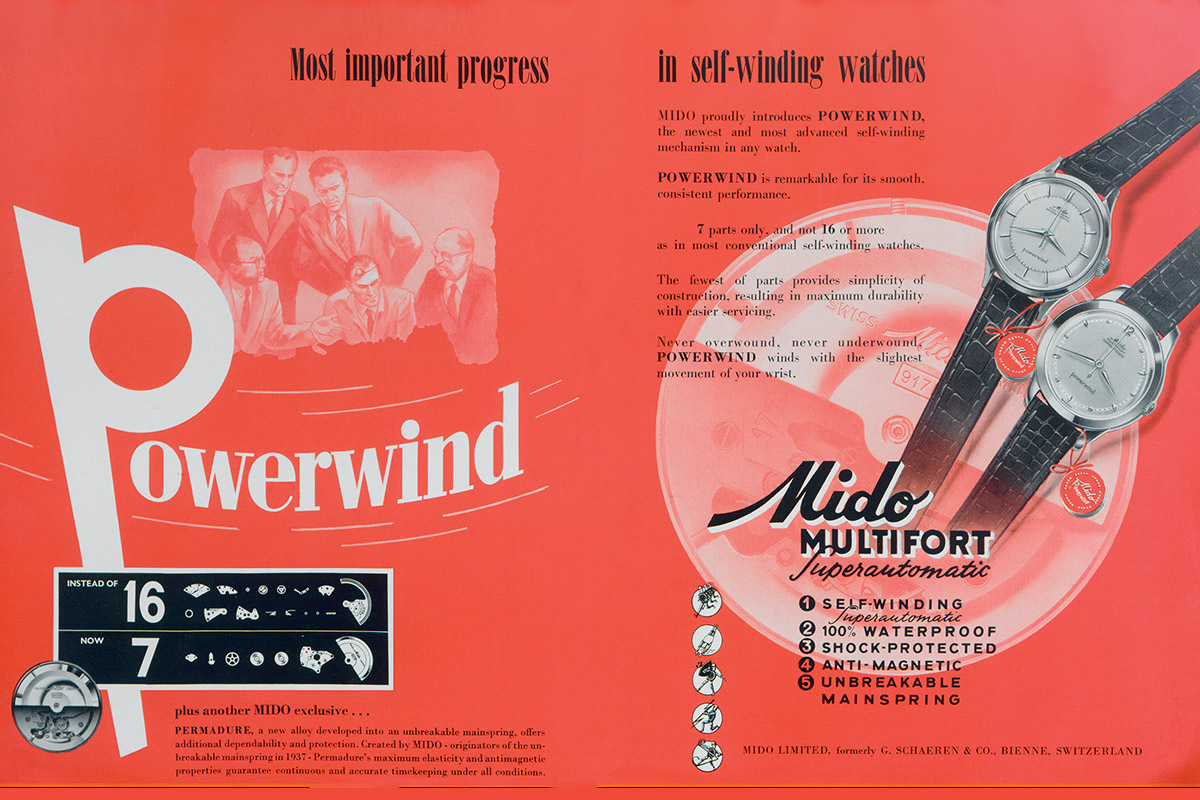 Correva l’anno 1954 e, come molti settori, anche quello degli orologi da polso era in pieno fermento innovativo, sulla spinta dell’entusiasmo e della voglia di rinascita che seguirono la fine della Seconda Guerra Mondiale. Era il momento giusto per sperimentare e lanciare nuovi prodotti, anche servendosi di tecnologie sviluppate nei decenni precedenti. Così fece Mido, presentando il suo Powerwind.