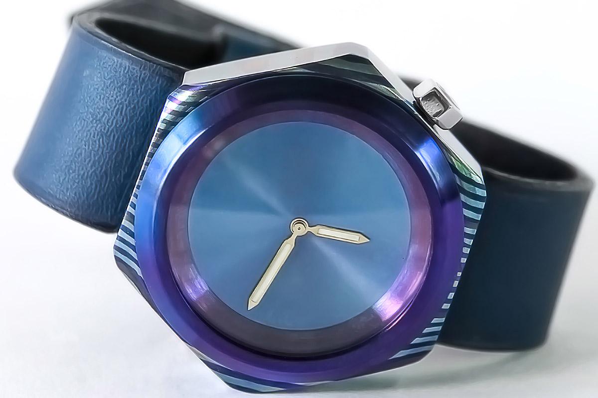 Quest’ultimo è un metallo forgiato, alla stregua del più noto (anche se altrettanto raro) acciaio damasco. In poche parole, il damasco di titanio è il risultato di un peculiare processo di lavorazione che prevede l’utilizzo di diverse leghe di titanio, forgiate e laminate insieme. Un composto formato da vari strati di titanio sovrapposti, fino a ottenere un semilavorato che si può “modellare” al tornio per ricavare la cassa (con tutte le difficoltà insite nella lavorazione del titanio). Tramite brunitura si raggiunge poi lo spettro di colori del titanio visibile sulla superficie della cassa: ciascun esemplare è pertanto unico per trama e sfumatura.