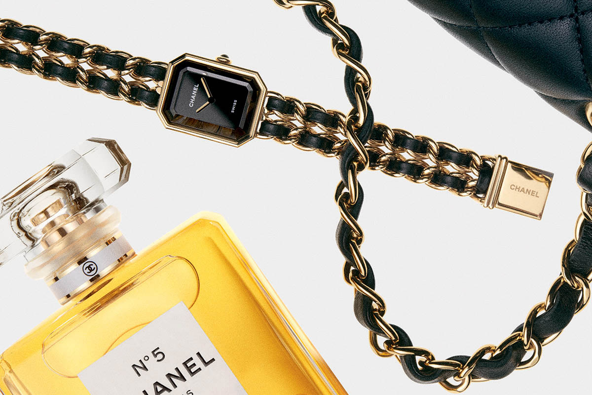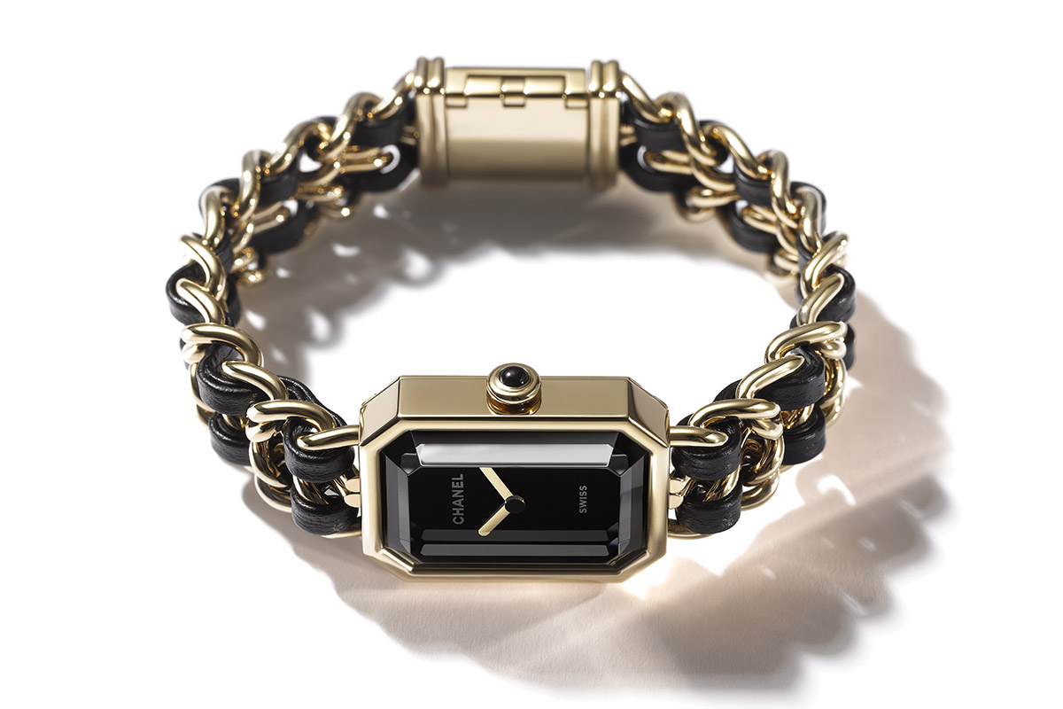Per passare ai colori: nero e oro, fra i prediletti da Mademoiselle. Basti pensare da un lato alla petite robe noire da lei inventata, dall’altro alla sua passione per i mosaici veneziani e per l’arte barocca. Un accostamento cromatico di forte impatto: tuttora ricorrente, tra l’altro, nella moda come nella gioielleria della Casa. E ancora, il bracciale dell’orologio: una sottile catena gourmette intrecciata con un nastro di nappa nera. Del tutto simile a quella che si trova nella tracolla della 2.55, la borsa matelassé lanciata nel febbraio 1955, un must have per generazioni di donne. Del resto, lo stesso Jacques Helleu lo aveva dichiarato apertamente nel 1987: per il Première «ho rivisitato i nostri classici».