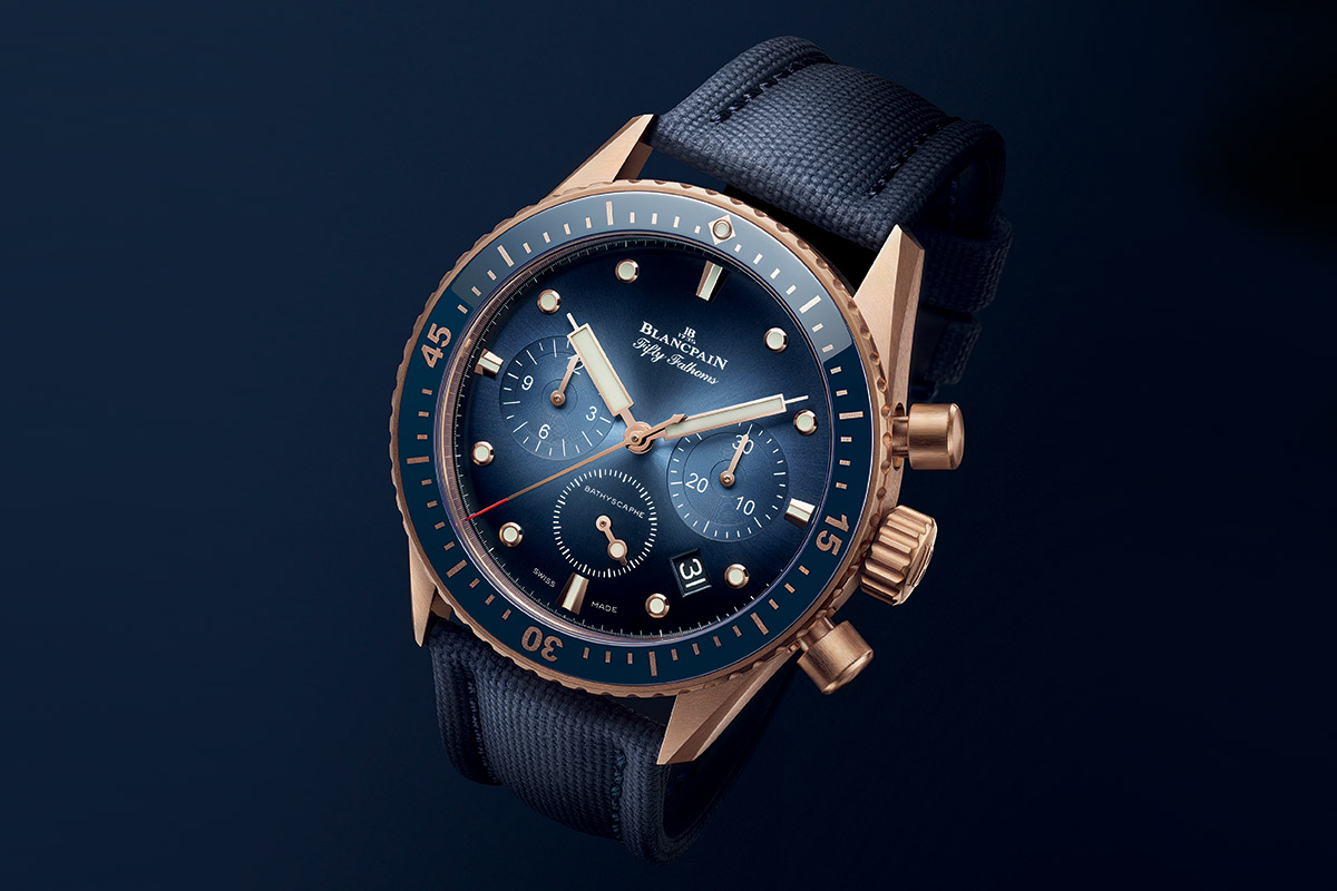 A proposito di orologi, vale la pena di spendere due parole anche a proposito degli ultimi esemplari realizzati da Blancpain per affrontare le profondità marine. Due ulteriori versioni del Fifthy Fathoms Bathyscaphe Chronographe Flyback che ampliano l’offerta del modello in catalogo dal 2014 con un’estetica rinnovata. Coerenti con la revisione cromatica di recente apportata dalla Manifattura alle varie linee della storica collezione di subacquei.