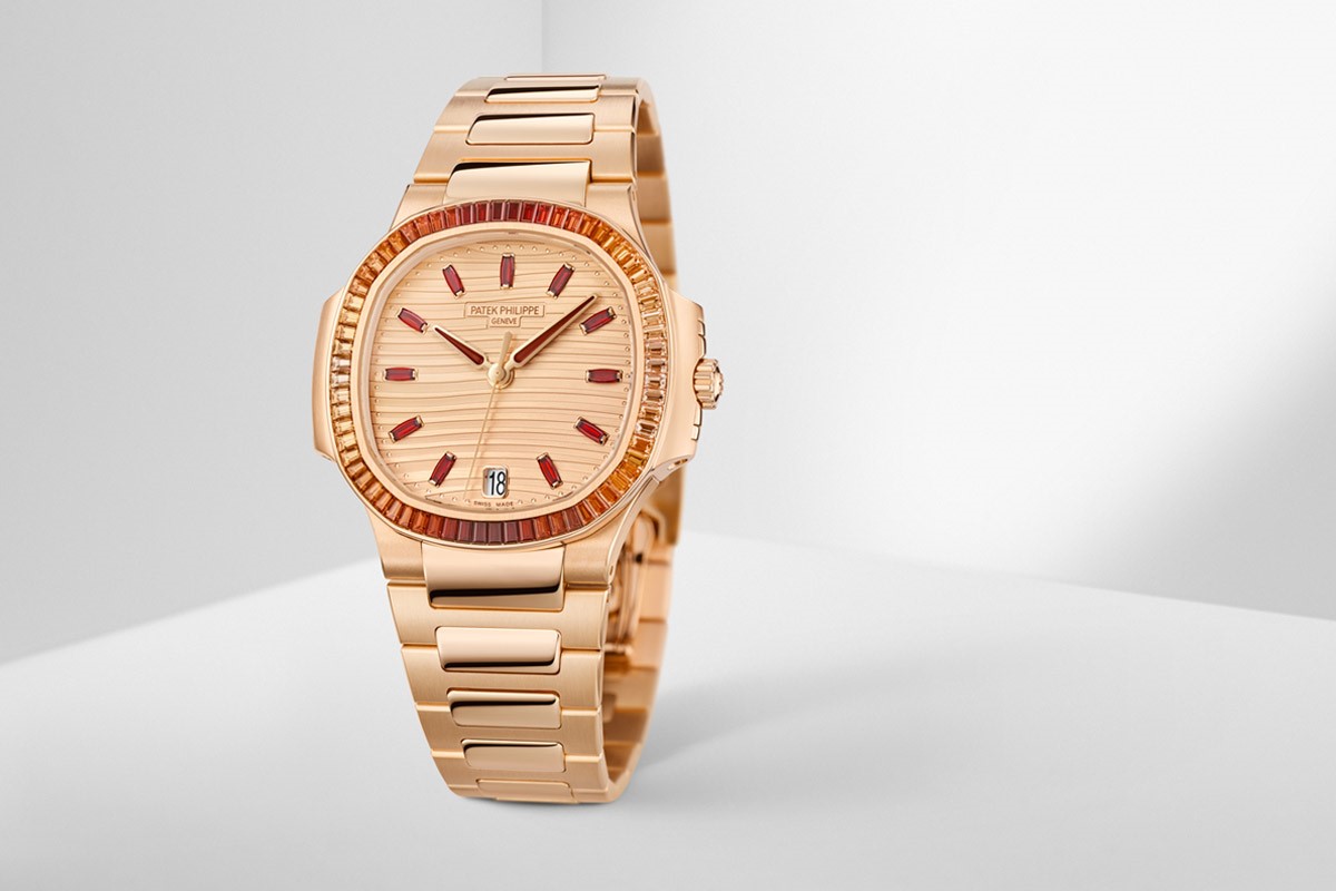 Quindi il Nautilus Joaillerie Ref. 7118. Forgiato interamente nell’oro rosa, ha la lunetta decorata da spessartine con sfumature differenti – dal color champagne al cognac, che coprono solo in parte la palette dell’arcobaleno –, tagliate di nuovo a baguette. La spessartina è un tipo di granato, la cui tonalità risulta più o meno scura a seconda del tenore di ferro. Altre 11 gemme di questo tipo, tagliate però a ogiva, si trovano poi sul quadrante inciso a onde. In questo caso il movimento è il Calibro 324 SC a carica automatica (diffuso in molti esemplari della Casa), il prezzo di 83.468 euro.