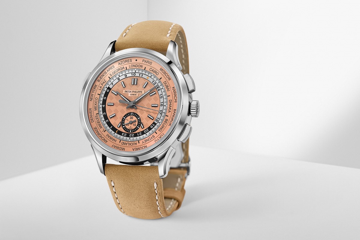 Per finire con la Ref. 5935A, un nuovo cronografo flyback con Ora Universale. Prima versione in acciaio di questa complicazione emblematica della Manifattura, già presente nella Ref. 5930P (in platino, con il look verde). Di cui monta lo stesso movimento, meccanico a carica automatica: il Calibro CH 28-520 HU. Ma se ne distingue – oltre che per il metallo – anche per il quadrante rosa salmone d’ispirazione rétro, con il centro decorato da un guilloché d’impronta moderna (chiamato “carbonio”, come quello della Ref. 6007, creata per l’inaugurazione della nuova Manifattura). Fornito di due cinturini in pelle di vitello, ha un prezzo di 64.390 euro.