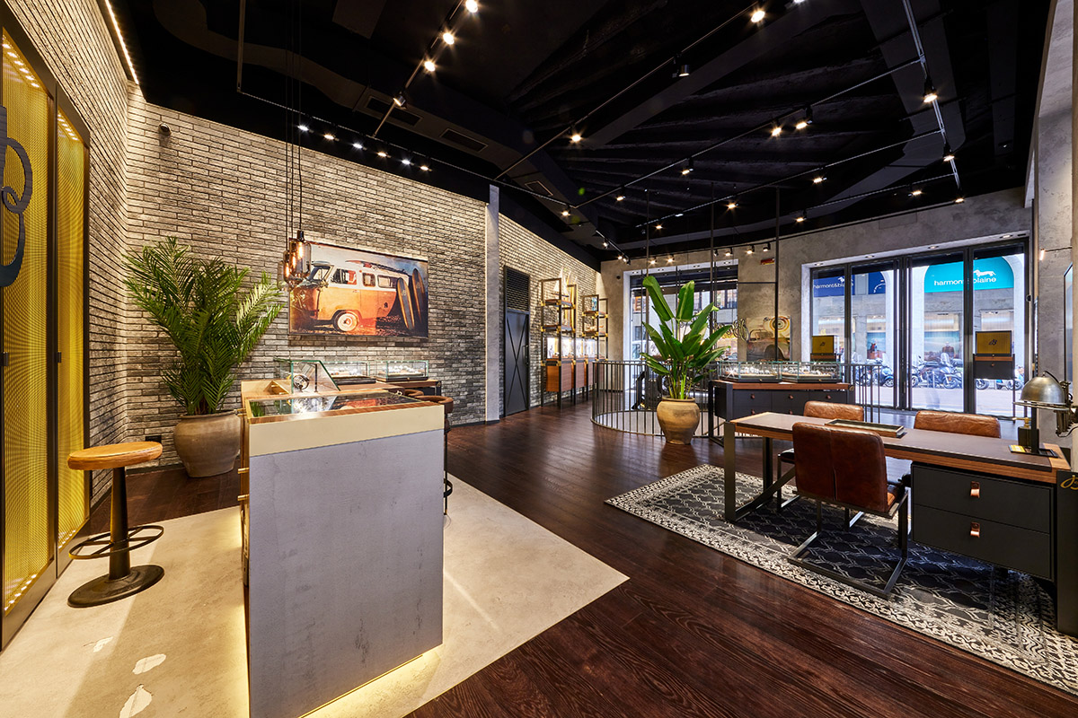 Per rendere possibili episodi del genere, bisogna trasgredire innanzitutto con le tradizionali dimensioni dei negozi d’orologeria, correndo anche tutti i rischi rappresentati da operazioni simili. Varcata la soglia, infatti, si entra in uno spazio rischiarato a giorno dalla luce provenente dalle cinque vetrine, affacciate a livello stradale. Poi una scala scende in un spazio altrettanto luminoso per via di vetrate “trompe l’œil” che danno su aeroporti e località di mare. Oltre 250 metri in tutto, con tanto di bar-espositore d’oggetti a pianterreno e un bar vero e proprio al livello inferiore, con un bancone da mescita di circa 7 metri: durante gli eventi in servizio continuo, mentre nelle giornate di sola affluenza di pubblico è il personale del negozio a occuparsi di caffè, bibite e quant’altro.