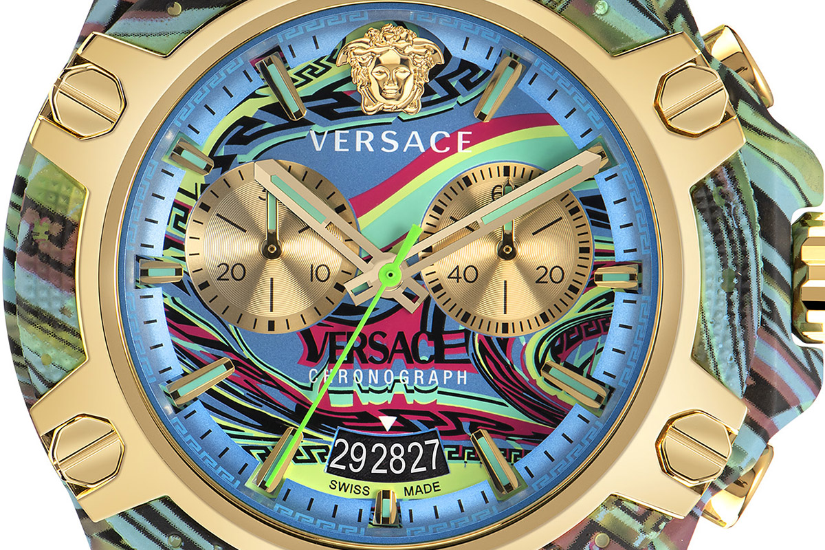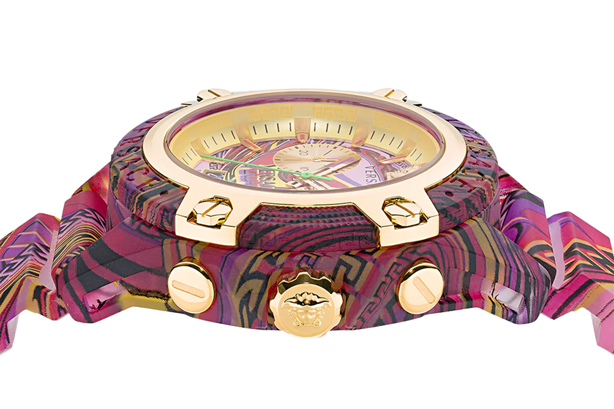 I rinnovati cronografi mantengono i tratti strutturali della famiglia di origine, quali la cassa in policarbonato chiusa in una gabbia metallica con 4 viti a vista, ma questa volta si avvolgono in una combinazione di colori energica ed energetica. Progresso e diversità infatti non guardano solo al pubblico. Si riversano anche nei nuovi pattern, un mix-and-match cromatico assolutamente inedito per la cassa e il cinturino. Un arcobaleno che, come un vortice di colori, investe con impeto i cronografi Icon Active. E da un lato li tinge di un luminoso giallo, un verde brillante, un azzurro profondo, un caldo rosa – amalgamati insieme come mai s’era visto finora. Dall’altro si trasforma in tocchi acidi e fluo a rinvigorire con forza l’intramontabile nero. Un gioco di contrasti che strizza l’occhio alla palette cromatica delle collezioni moda Versace.