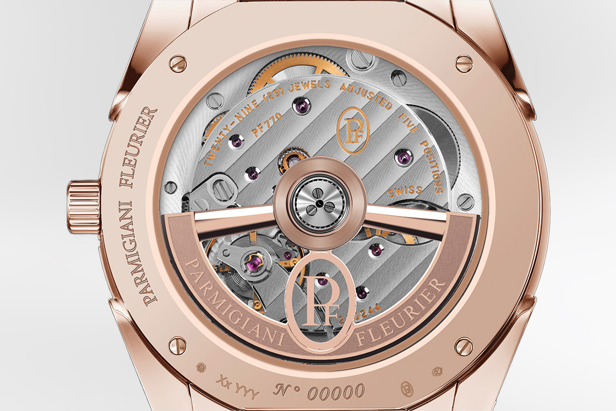 A proposito di finiture, un’estrema cura si ritrova anche nel movimento, che si può ammirare attraverso il fondello in vetro zaffiro. Il Tonda PF Automatic 36mm è equipaggiato dal calibro di manifattura PF770, concepito e sviluppato appositamente per questo modello. A carica automatica, appunto, è interamente decorato e realizzato – come di consueto per il Marchio – secondo gli standard dell’alta orologeria: platina colimaçonné, ponti a Côtes de Genève, anglage di tutti i componenti, dettagli dorati e massa oscillante scheletrata in oro rosa 22 carati lucido-satinato, personalizzata dal logo.
