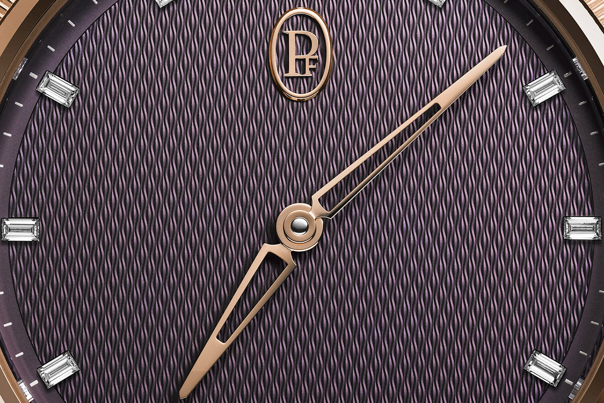 Il che è suffragato anche dalle proposte cromatiche. Il Tonda PF Automatic 36mm è declinato in tre referenze, con il quadrante in diversi colori: Silver Sand e Warm Grey per le versioni in acciaio con lunetta in platino e Deep Ruby per la variante in oro rosa. Tonalità particolari, per non dire insolite, eppure azzeccate, perché eleganti ma non scontate, in equilibrio fra il sobrio e l’originale. Sicuramente di gran classe, soprattutto quel rubino scuro/vinaccia che sembra dare maggior enfasi al raffinato motivo guilloché grain d’orge tipico di tutta la collezione.