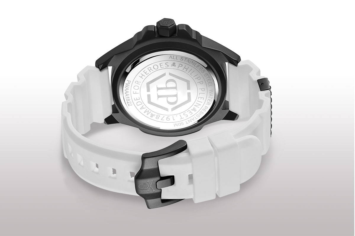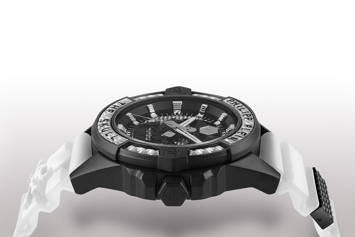È caratterizzante la lunetta, sempre in fibra di carbonio. Contiene tutti gli elementi visuali distintivi della collezione: il doppio logo PP racchiuso nei due esagoni e il lettering Philippe Plein e The Skull. Ed è rock e ribelle anche il cinturino in silicone, disponibile tre varianti: bianco, nero o blu. Personalizzato da un lato dallo $kullbone in rilievo, e dall’altro da un passante in metallo decorato da borchie.
