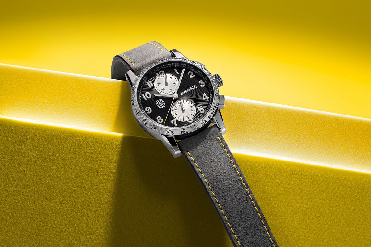 Quest’ultimo, una spilla donata dal poeta Gabriele D’Annunzio, era notoriamente il portafortuna di Nuvolari, che lo indossava sull’inconfondibile maglione giallo. Il nuovo modello riserva uno spazio anche a questo colore emblematico: lo troviamo a ore 12, nella scala tachimetrica del réhaut, sulla punta della lancetta centrale cronografica e nelle impunture del cinturino in pelle grigia effetto vintage.