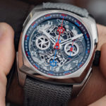 A proposito del volume, la cassa ha un diametro di 42 mm e uno spessore di 16,5 mm. Del resto il movimento, a sua volta, ha uno spessore di 11,65 mm. Non eccessivo, in realtà. Considerate che un “normale” 7750 (il celeberrimo calibro Eta/Valjoux) misura 7,9 mm di spessore: ed è un cronografo “singolo”, dalla costruzione tradizionale, privo perfino di ruota a colonne. In questo caso, il calibro Cyr718 racchiude invece un doppio cronografo, montato su due platine. Una differenza di nemmeno 4 millimetri mi sembra quindi più che comprensibile…