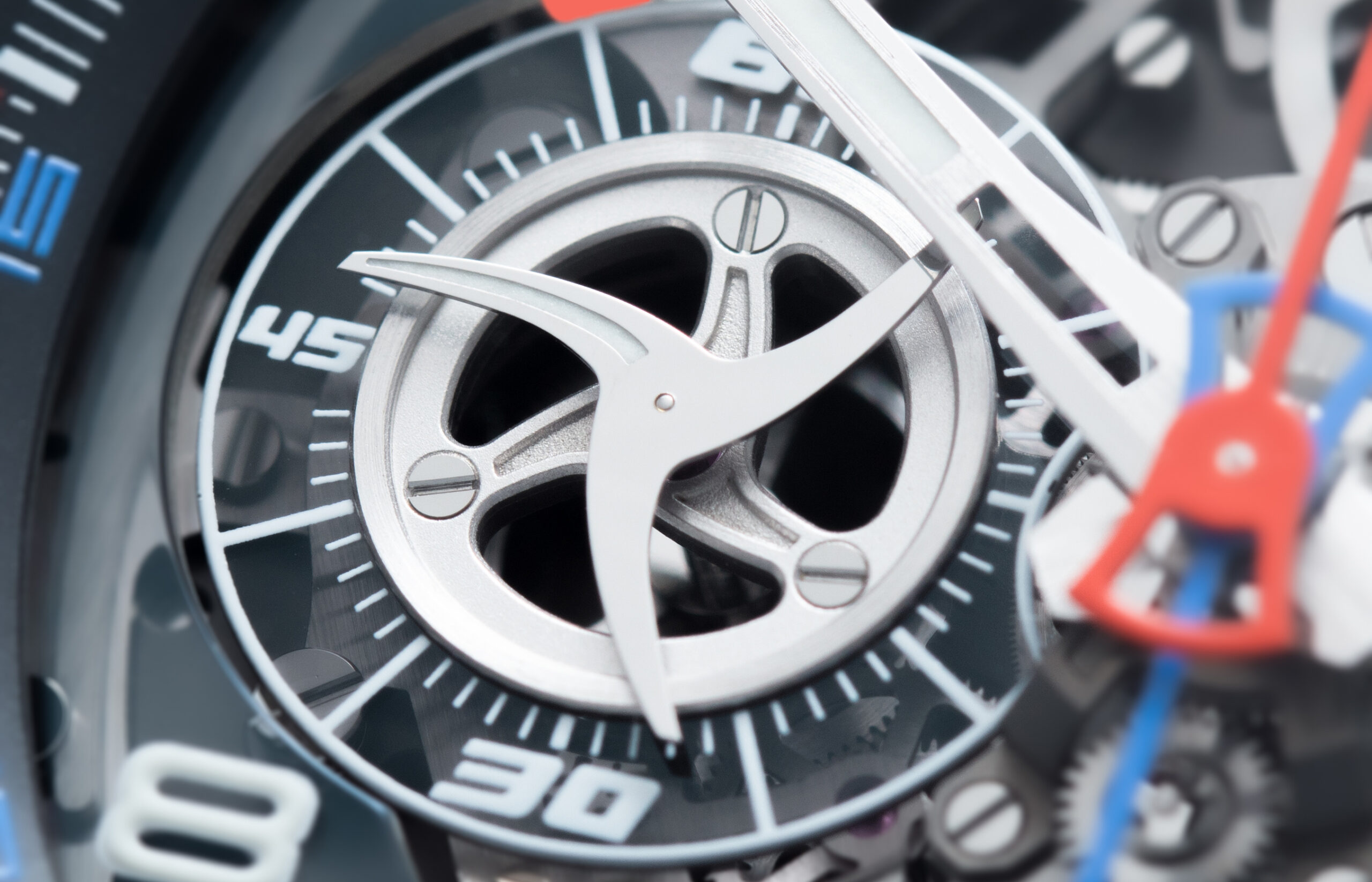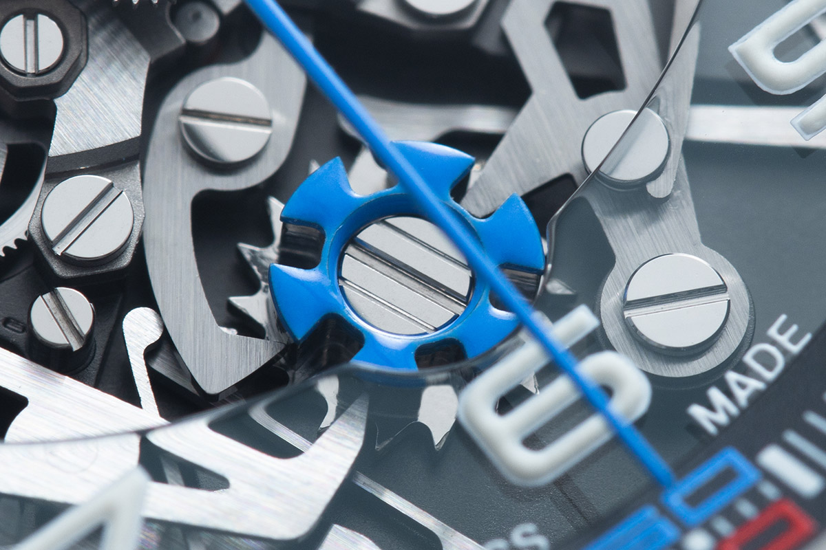 In effetti, dato che le due platine sono sovrapposte e collocate sullo stesso lato, côté cadran, la duplice parte cronografica del movimento risulta così esposta alla vista (la si apprezza sotto il vetro zaffiro). L’uso di colori diversi per le due sezioni cronografiche permette infine di distinguere le misurazioni e ne facilita appunto la leggibilità: da un lato quindi c’è il cronografo rosso, dall’altro quello blu. Il tutto reso ancora più immediato dalla costruzione ribaltata, che evita di creare confusione.