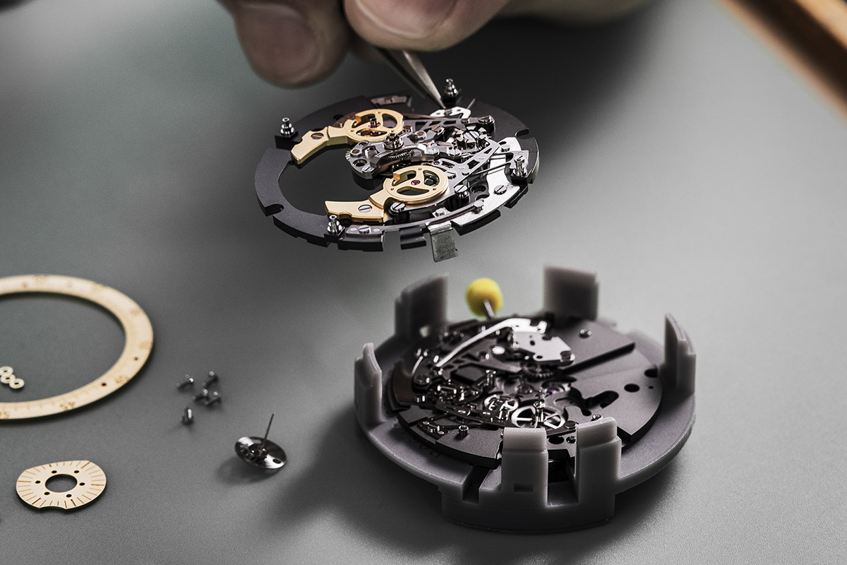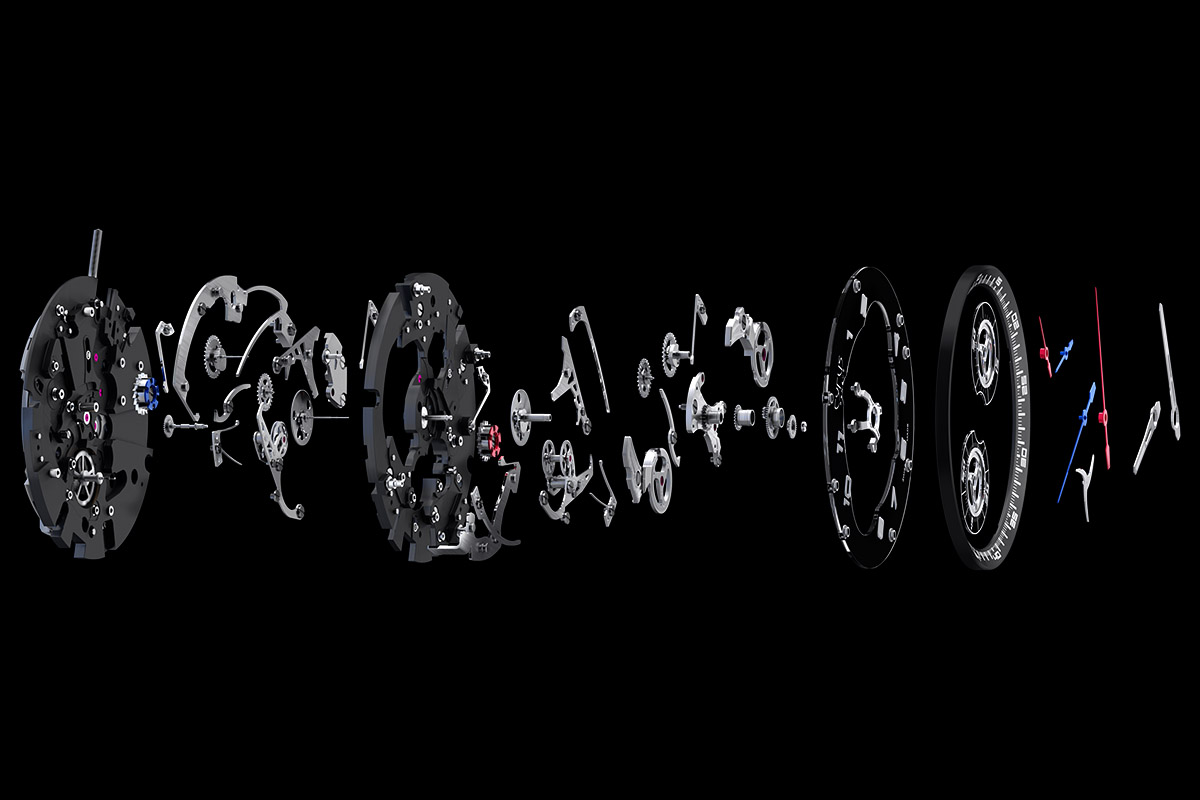 «L’architettura è molto logica», spiega ancora Mojon. «Per minimizzare lo spessore del movimento, i due meccanismi hanno una disposizione speculare sulle due metà della superficie del movimento e si uniscono sull’asse centrale combinando le indicazioni. Ogni cronografo è posto su una propria platina. Questa sistemazione permette una visione ottimale delle funzioni ed enfatizza la cinetica dei cronografi».