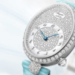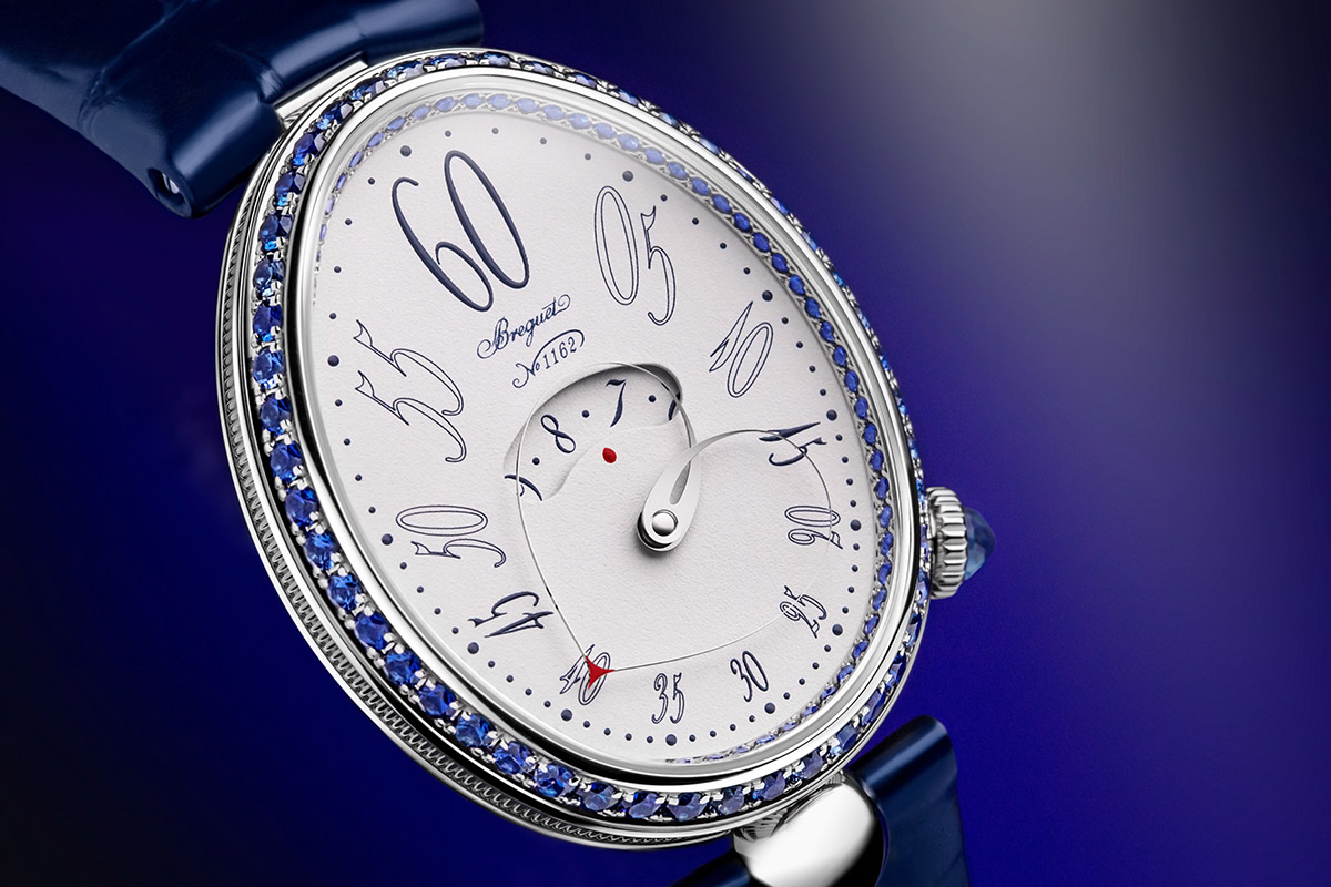 Se la meccanica del Reine de Naples 9838 è la stessa del Coeur, diverso però è l’habillage. Il nuovo esemplare si distingue per l’estetica giocata nei toni del bianco e del blu, eccetto per i piccoli indicatori delle ore e dei minuti laccati di rosso. La cassa in oro bianco ha la lunetta e il réhaut decorati da zaffiri blu, di diverso formato ma tutti taglio brillante; sulla corona è incastonato un altro zaffiro briolette. Infine il quadrante è laccato bianco con numeri in dégradé e indici blu.
