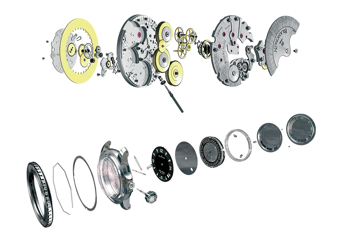 Nel 2007 fu così lanciata una nuova trilogia di esemplari che pose le basi della collezione tuttora in catalogo. Il primo era il Fifty Fathoms Automatique, simile nell’estetica e nel mood al modello originario, ma con un nuovo movimento di manifattura, il calibro 1315. Derivato dal calibro 13R0 a carica manuale, del 2006, si distingue(va) per la presenza di tre bariletti, in grado di garantire un’autonomia di 5 giorni. Il secondo era il Fifty Fathoms Chronographe Flyback, con i pulsanti a tenuta stagna, cioè studiati per poter attivare il cronografo anche sott’acqua. Infine, il Fifty Fathoms Tourbillon, sicuramente il meno adatto alle immersioni, realizzato con fini celebrativi. Equipaggiato di tourbillon volante e fondello in vetro zaffiro, ma impermeabile comunque fino a 30 atmosfere, era una dimostrazione del savoir-faire della Casa.