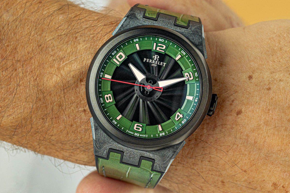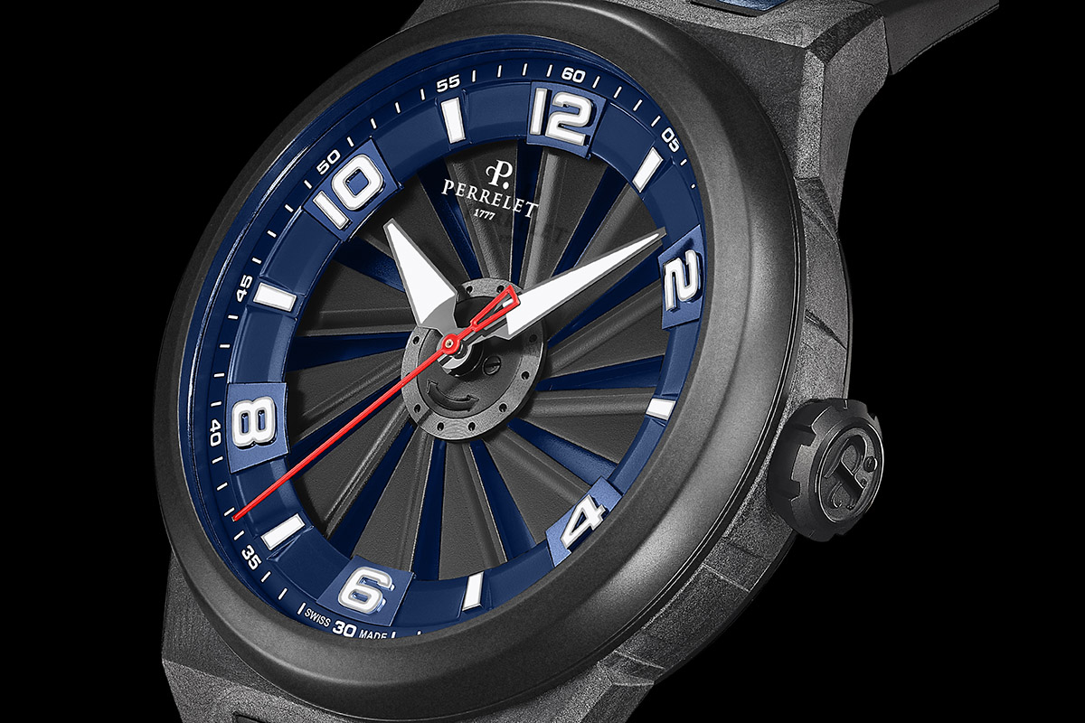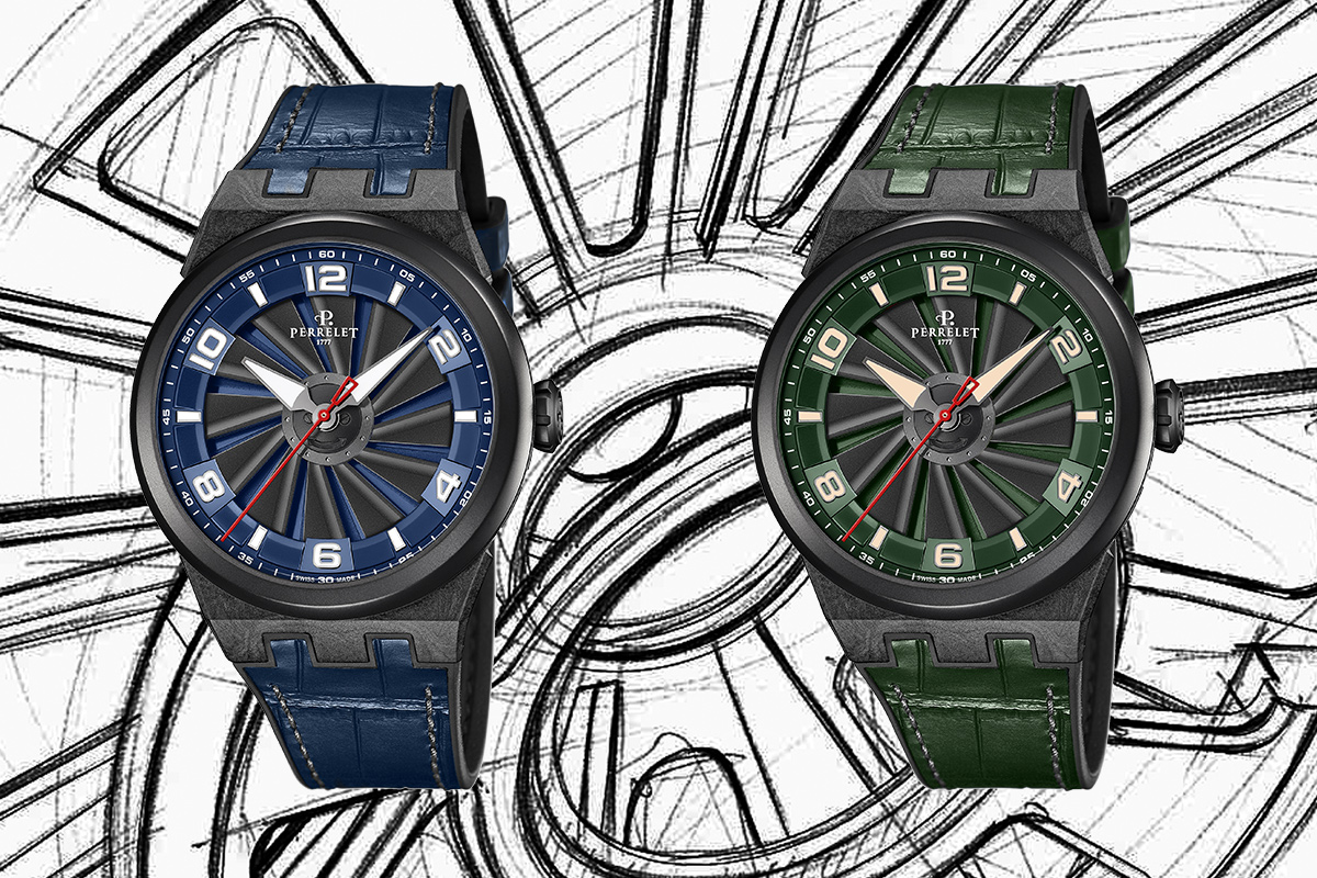 Perrelet ha presentato recentemente due nuove versioni nella collezione Turbine Carbon: il Turbine Carbon Forest Green e il Turbine Carbon Midnight Blue. Rispettivamente nei colori verde bosco e blu notte che decorano il quadrante inferiore e il display dell’ora, grazie alla tecnologia Turbine, brevettata nel 2009. Una sorta di elica in cui le pale in alluminio anodizzato, ruotando, mettono in evidenza le gradazioni cromatiche scelte per il quadrante. Sotto a cinque pale si trovano dei contrappesi in tungsteno a garantirne l’equilibrio e la stabilità.