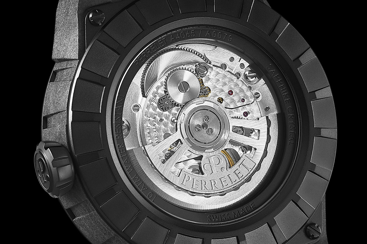 Se poi alla parola motore affianchiamo il sostantivo turbina, il pensiero va al mondo della mobilità aerea, navale, terrestre – o alle industrie manifatturiere in cui la potenza del motore di un impianto è aumentata grazie alla velocità con la quale girano le pale dell’elica. In aeronautica le turbine di un motore a reazione ruotano a 180mila giri al minuto, le 12 pale degli orologi Perrelet sono invece legate alla rotazione impressa dal movimento. A differenza del Doppio Rotore – la prima tecnologia brevettata nel 1995 da Perrelet, in cui due masse oscillanti fornivano energia al movimento – la tecnologia Turbine è svincolata dal bariletto e non influisce sull’autonomia residua. Le pale degli orologi Perrelet svolgono quindi una funzione puramente estetica, anche se presentano aspetti di difficile realizzazione: sia per lo spessore e il peso, sia per la precisione micrometrica con la quale devono essere centrate sul quadrante.