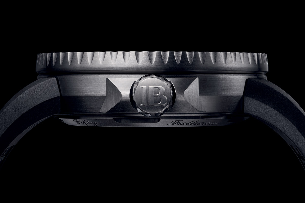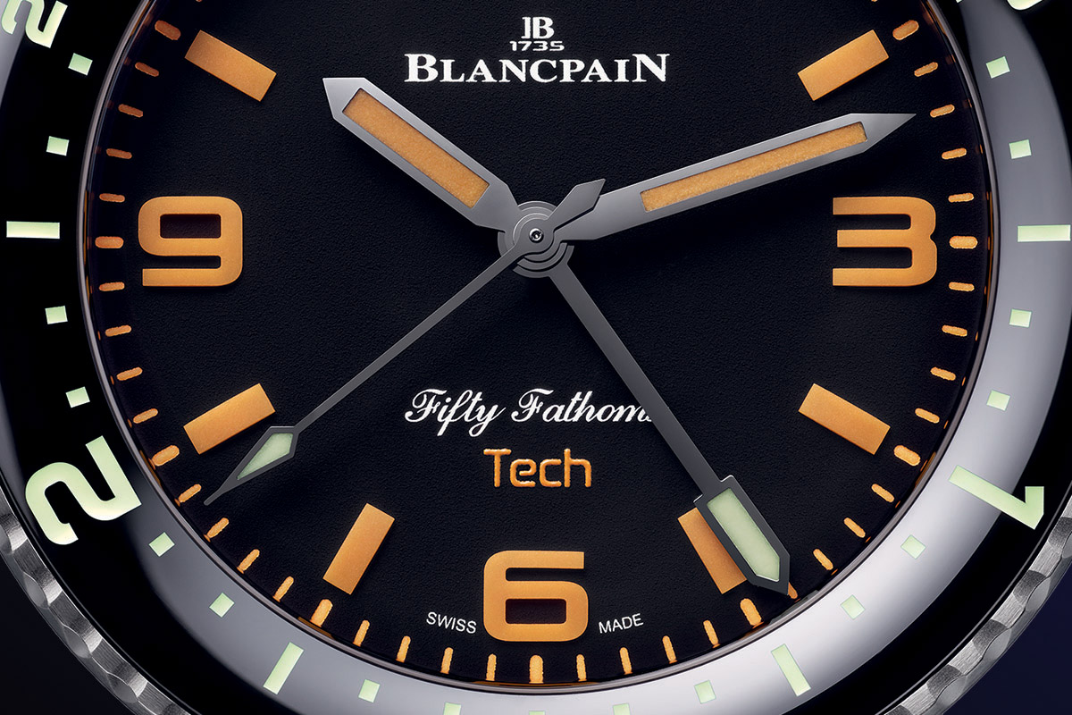 Per scoprirla, basta dare un’occhiata alla lunetta girevole unidirezionale del Fifty Fathoms Tech Gombessa. Diversamente da quelle che troviamo di solito sugli orologi da immersione, questa ha una graduazione su una scala di 3 ore. È connessa a una lancetta speciale, che effettua un giro completo del quadrante esattamente in 3 ore e si regola attraverso la corona di carica. Il materiale e il colore della lancetta, un rivestimento luminescente bianco a emissione verde, sono abbinati a quelli degli indici.