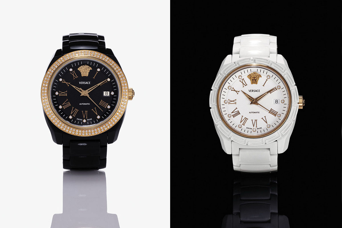 Presentato alla fiera di Basilea nel 2005 – lo ricordo bene –, era il primo orologio disegnato da Donatella Versace (da cui il nome). Aveva la cassa da 41 mm di diametro d’impronta unisex (all’epoca si diceva così), ed era realizzato interamente in ceramica, materiale high-tech simbolo di modernità. Declinato in due colori tendenza, bianco ghiaccio o nero jet (giaietto), era palesemente Versace fin dal primo sguardo. Riportava infatti ben visibili i simboli della griffe: la testa di Medusa in rilievo, a ore 12 e sulla corona, la Greca riprodotta sulla lunetta, anch’essa in ceramica – una novità per il settore. Ma esisteva anche in versione gioiello, con due file di diamanti incastonati sulla ghiera in oro rosa.