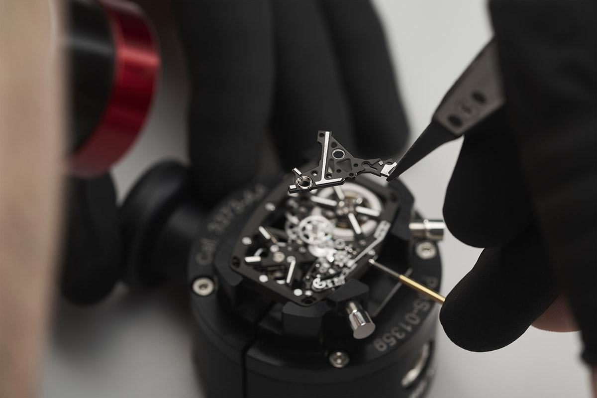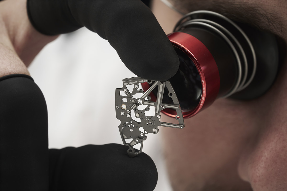 Trattandosi di un orologio sportivo, il calibro è il più compatto fra tutti quelli sviluppati da Richard Mille ed è stato sottoposto a una serie di test rigorosi per garantirne la resistenza ad accelerazioni fino a 5000 G. La sua compattezza è una sfida anche per il maestro orologiaio, il quale si trova ad affrontare una fase di assemblaggio notevolmente più complessa del normale, durante la quale non ha margini di errore.