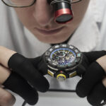 E anche il movimento, la parte virtualmente meno robusta che affida la propria incolumità alle prestazioni della cassa, è costruito per resistere. Il calibro automatico di manifattura CRMA8 è stato sviluppato appositamente per garantire la rigidità della propria architettura: la platina e i ponti in titanio grado 5 sono rinforzati da un trattamento superficiale Pvd nero. Il bilanciere a spirale libera garantisce a sua volta una maggior affidabilità in caso di urti.