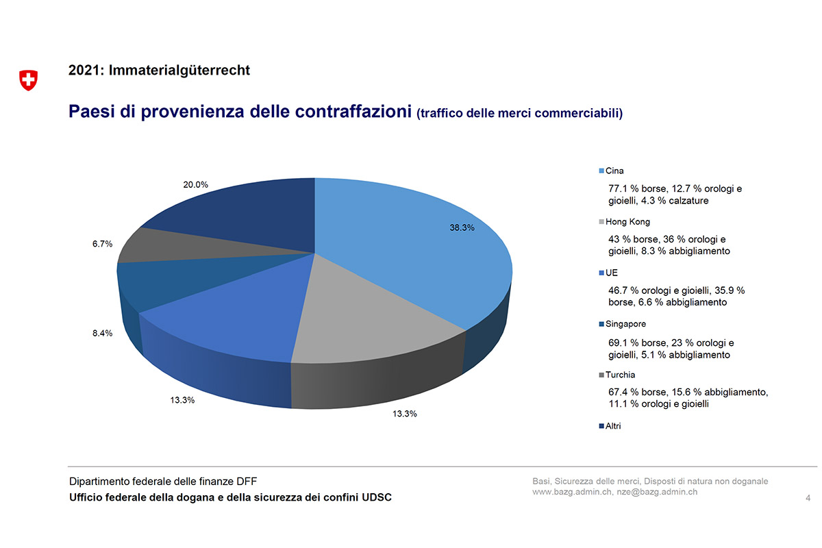 Il ritorno sull’investimento per produrre merce contraffatta, piuttosto marginale, è 10 volte superiore alla cifra investita. Non a caso il mercato del falso resta una delle maggiori fonti di finanziamento della criminalità organizzata, dalle mafie al terrorismo. I principali Paesi di provenienza delle importazioni di falsi in Italia, sequestrati dalle autorità doganali, sono Hong-Kong, Cina, Turchia, Singapore, Libano e Thailandia.