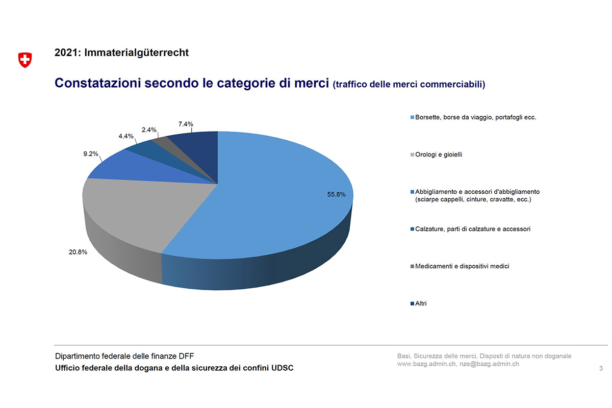 Dal rapporto Iperico 2022, che elabora dati acquisiti da diverse autorità competenti, si evince che nel 2021 la Lombardia è stata la regione con più sequestri (23% del totale), seguita da Lazio e Puglia. La Toscana ha fatto registrare il maggior quantitativo di merce sequestrata (il 27% del totale), a seguire Lazio e Campania. Sempre in Toscana, il maggior valore economico stimato della merce sequestrata (il 28% del totale), ben staccata da Lazio e Puglia. Orologi e gioielli rappresentano il 9% del numero di sequestri per categoria merceologica.