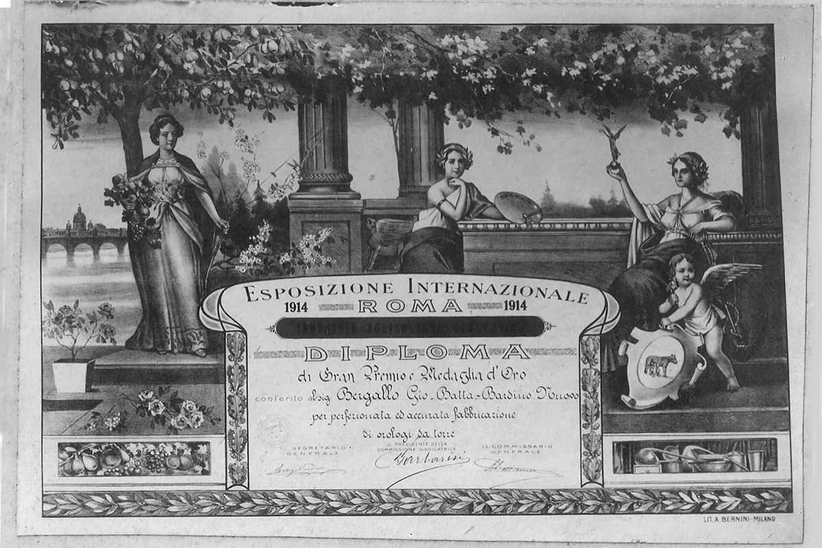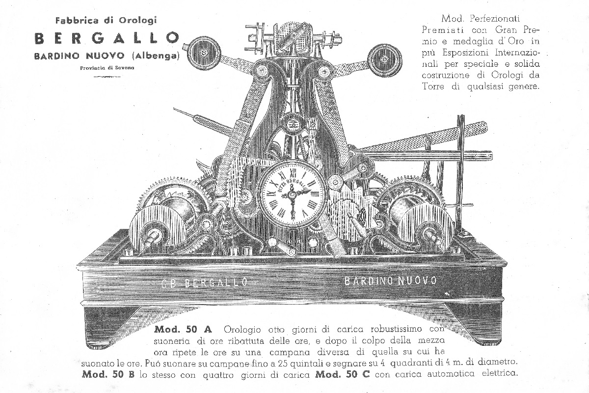 Ma fu soprattutto il figlio Giovanni Battista, dotato di non comuni doti imprenditoriali e di intraprendenza, a sviluppare a inizio Novecento l’attività, ampliando la rete di relazioni commerciali e trasformando il lavoro da esclusivamente artigianale a semi-industriale, seppur nella piccola scala: i telai degli orologi erano infatti realizzati da importanti fonderie savonesi e poi le varie parti venivano assemblate in officina a Bardino Nuovo. L’attività rimase florida fino al secondo Dopoguerra, quando la diffusione degli orologi elettrici e poi elettronici si rivelò alla lunga esiziale per l’officina Bergallo, non in grado di adeguarsi alla nuova produzione. Nonostante ciò, Giovannino, ultimo esponente degli orologiai Bergallo, continuò a lavorare fino all’età di oltre ottant’anni. Ed ebbe il grande merito di intuire l’importanza della storia e della cultura del lavoro di cui le vicende della sua famiglia erano depositarie, non disperdendone la memoria».