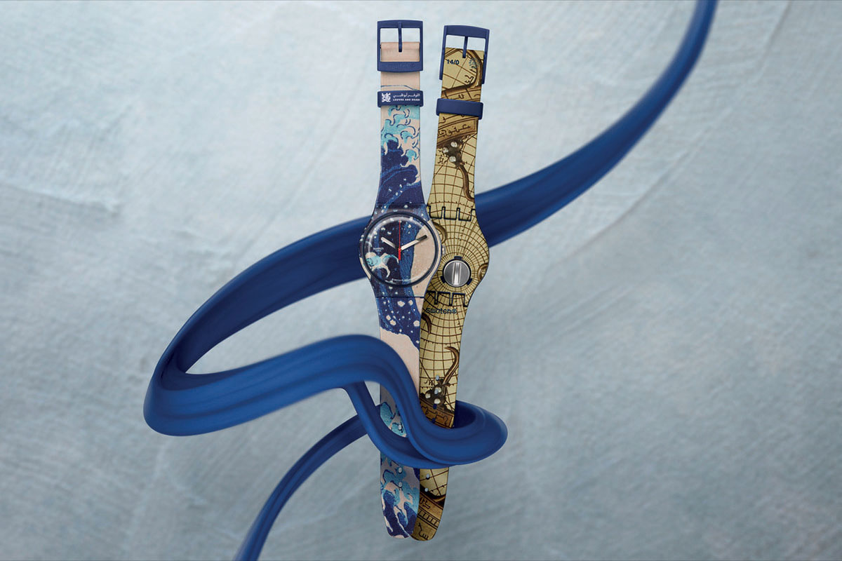 Lo stesso discorso, del resto, si potrebbe fare anche per La grande onda di Kanagawa, realizzata dal pittore/incisore giapponese Hokusai nel 1830 circa e oggi conservata negli Emirati. Anche qui lo Swatch dedicato, che visualizza un segmento della famosissima xilografia, inquadra un singolo dettaglio. Ma il motivo sul quadrante sembra perdere qualsiasi connotazione figurativa per diventare un’opera d’arte astratta contemporanea. In più, sul fondello e sul cinturino, l’orologio è stampato con l’immagine di un antico astrolabio dell’astronomo e matematico persiano Muhammad ibn Ahmad Al–Battûtî, esposto sempre nel museo di Abu Dhabi. Un manufatto secolare, a rappresentare la progredita cultura araba d’antan.