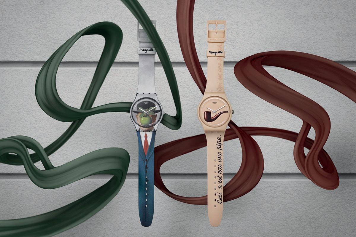Quindi René Magritte, di cui quest’anno ricorre il 150° anniversario di nascita. Del maestro del Surrealismo belga la collezione Swatch Art Journey riprende sempre due capolavori: La Trahison des Images e Le Fils de l’Homme. Credo proprio che qui i designer di Swatch siano riusciti a dare il meglio a sé. Perché sono stati capaci di giocare in modo ironico con il concetto stesso dell’opera, basata sulla distinzione fra oggetto e rappresentazione, fra realtà e immagine. Per cui l’affermazione “Questa non è una pipa” acquista il logico e inappuntabile riscontro “Questo è un orologio”, come si legge lungo tutto il cinturino con la stessa grafia corsiva della didascalia originale. Nell’altro esemplare, invece, la citazione diventa “Questo è uno Swatch con una mela”, dalla verità lapalissiana.