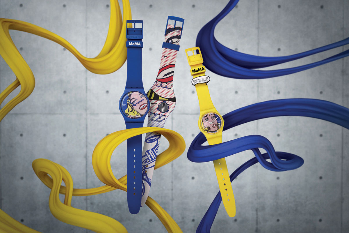 Infine un’altra doppietta su Roy Lichtenstein: Girl e Reverie. Notevole in questi esemplari è la resa della “poetica” del padre della Pop Art, nato esattamente 100 anni fa. Le immagini ne riprendono tutta l’espressività derivata dal mondo pubblicitario e dei fumetti, simbolo della società americana anni Sessanta. Anche in questi casi, il cinturino diventa parte integrante dell’opera. Un esemplare è interamente decorato sul lato interno con la tecnica del puntinato Ben-Day (un po’ come se fosse un dipinto double face). L’altro invece riporta il testo “The melody haunts my reverie”, che fa parte dell’originale, sul passante mobile. A conti fatti, si tratta quasi di un’esaltazione dello Swatch, che è un oggetto pop già di per sé.