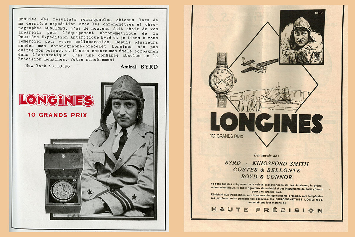 Entrato a far parte della squadra aerea della Marina statunitense nel 1918, Richard Evelyn Byrd (1888/1957) è stato fra i primi a sorvolare l’Artico, con il co-pilota Floyd Bennet nel 1926. (Anche se non toccò esattamente la verticale del Polo Nord, impresa riuscita pochi giorni dopo dal dirigibile Norge di Amundsen, Nobile ed Ellsworth). Comunque Byrd è ricordato soprattutto per le quattro spedizioni in Antartide realizzate fra il 1928 e il 1947, dove utilizzò cronometri e cronografi Longines. Se ne ha diretta testimonianza anche nei carteggi conservati negli archivi di St. Imier, in cui l’esploratore esprime apprezzamento per la strumentazione della Casa. In particolare, nella missione del 1939, porta con sé proprio un cronografo 13 ZN con funzione flyback.