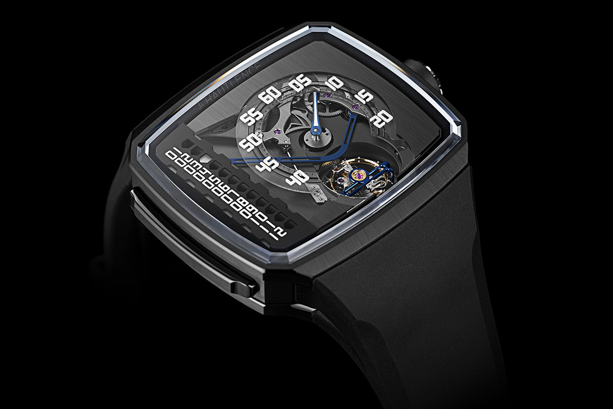 Infine il quadrante principale, parzialmente aperto, caratterizzato da una bella satinatura verticale che si ritrova anche sulla carrure, tra la lunetta e l’attacco del cinturino. Il blu e il grigio della precedente referenza lasciano il posto a un rivestimento Pvd nero che contrasta con gli accenti azzurrati della lancetta dei minuti, della leva delle ore e del ponte del tourbillon. Dettaglio sfizioso, la corona scanalata (sempre con trattamento Pvd nero) ha una banda in gomma che richiama il cinturino, anch’esso in gomma e con fibbia ad ardiglione.