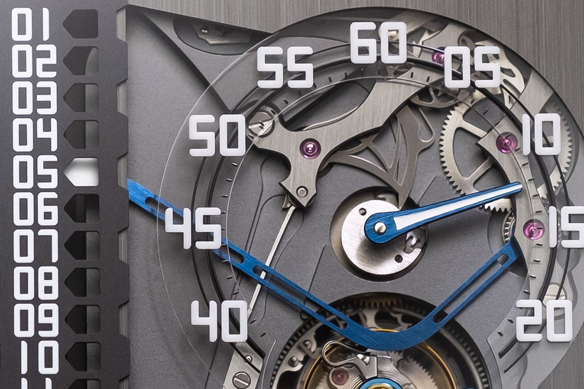 La piccola lancetta bianca che indica l’ora sulla scala lineare è posta all’estremità di una grande leva curva, scheletrata e azzurrata, che attraversa l’intero quadrante. Man mano che la leva si sposta dall’1 al 12, la ruota cui è collegata accumula progressivamente energia tramite un sistema di molle. Una volta superato il 12, un elemento a chiocciola sgancia la leva e libera così l’energia accumulata, grazie alla quale la leva stessa riporta con un salto la lancetta bianca al numero 1. E riparte il circo.