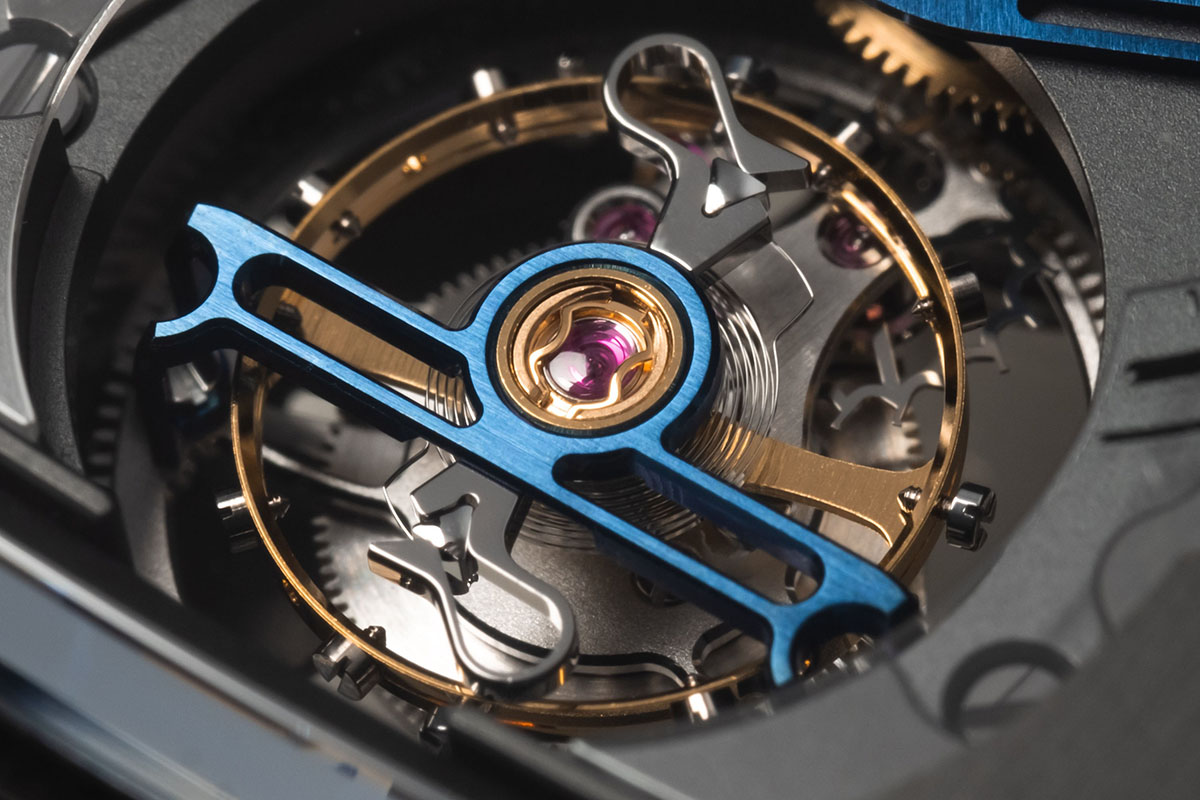Oltre all’ora saltante, retrograda e lineare, ho detto che c’è anche il tourbillon. Che non passa certo in secondo piano, anzi, è un bellissimo tourbillon volante a 1 minuto posto a ore 6 ed evidenziato da un elegante ponte scheletrato e azzurrato, come la leva delle ore.