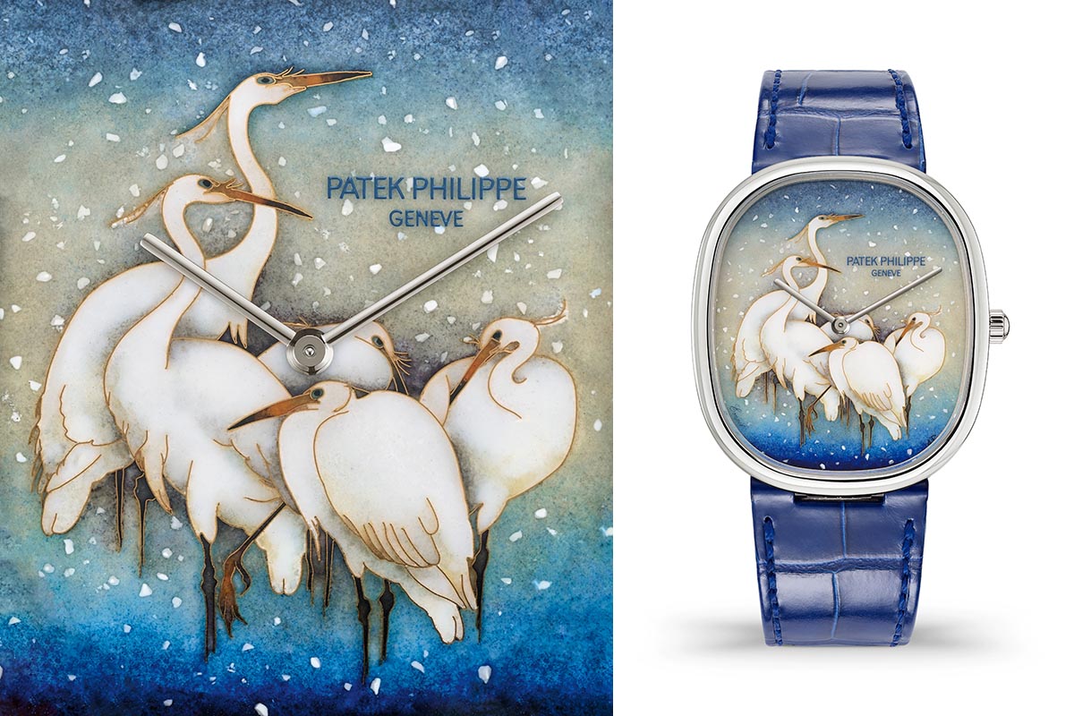 Ancora una volta, l’ormai annuale esposizione testimonia il savoir-faire di Patek Philippe nei più rari mestieri d’arte: dalle tante versioni di smalto – Grand Feu, cloisonné, champlevé, paillonné, pittura miniata, grisaglia, flinqué – fino all’incisione a mano, il guilloché, l’incastonatura. Tecniche antiche, perfino ancestrali, e attuali, comprese quelle più innovative per l’orologeria, come il micro-intarsio in legno e gli smalti di Longwy su porcellana. Una combinazione perfetta di abilità artigianale e creatività.
