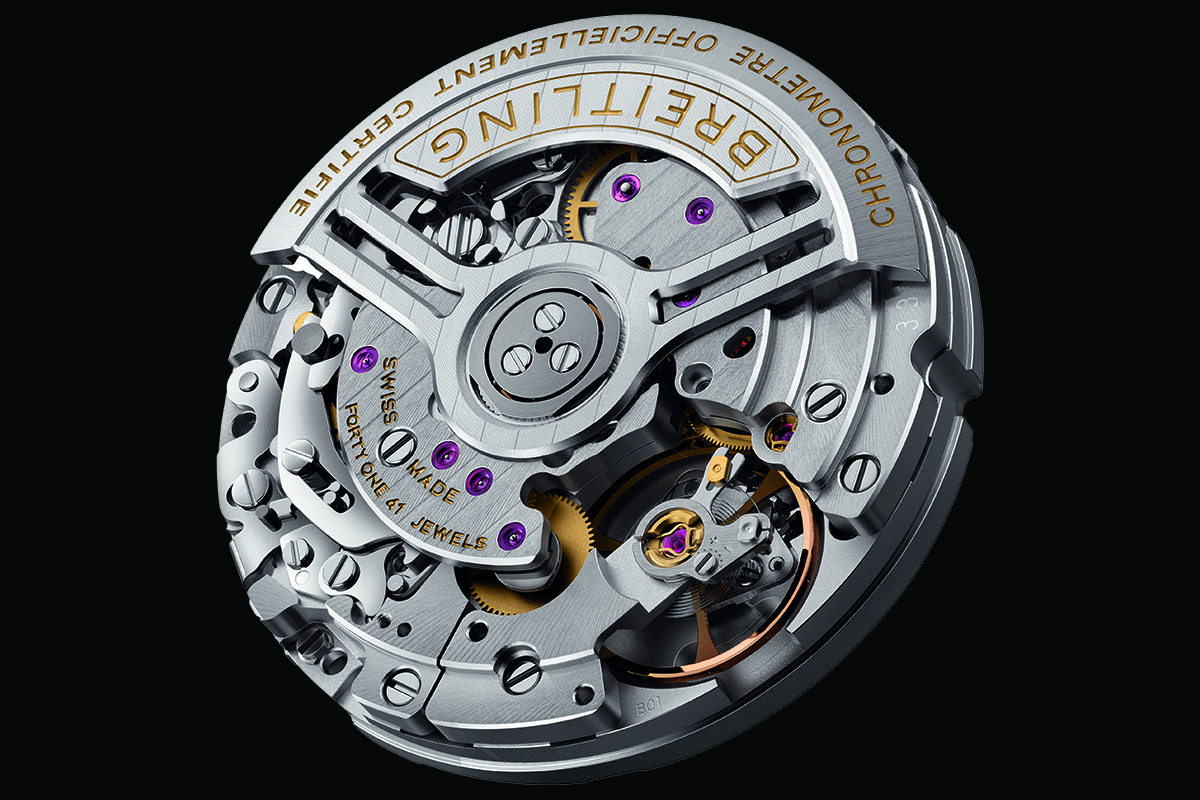 L’ultima versione del calibro B01 montata all’interno dei nuovi cronografi Premier è stata ridisegnata lo scorso anno e si differenzia dai precedenti per la massa oscillante traforata e per le nuove decorazioni che portano a un livello di finitura superiore. Nonostante sia un calibro più che rodato, Breitling lo sottopone internamente a una rigorosa sequenza di prove di laboratorio che ne controllano e ne confermano le performance. Per esempio i test sugli urti (circa 60mila urti a 500 G), sulla ricarica della massa oscillante (3.456.000 cambi di direzione), sui pulsanti del cronografo (circa 5.840 attivazioni delle funzioni di avvio, di stop e di reset), e sulla corona (100mila giri), che equivalgono a 16 anni di invecchiamento.