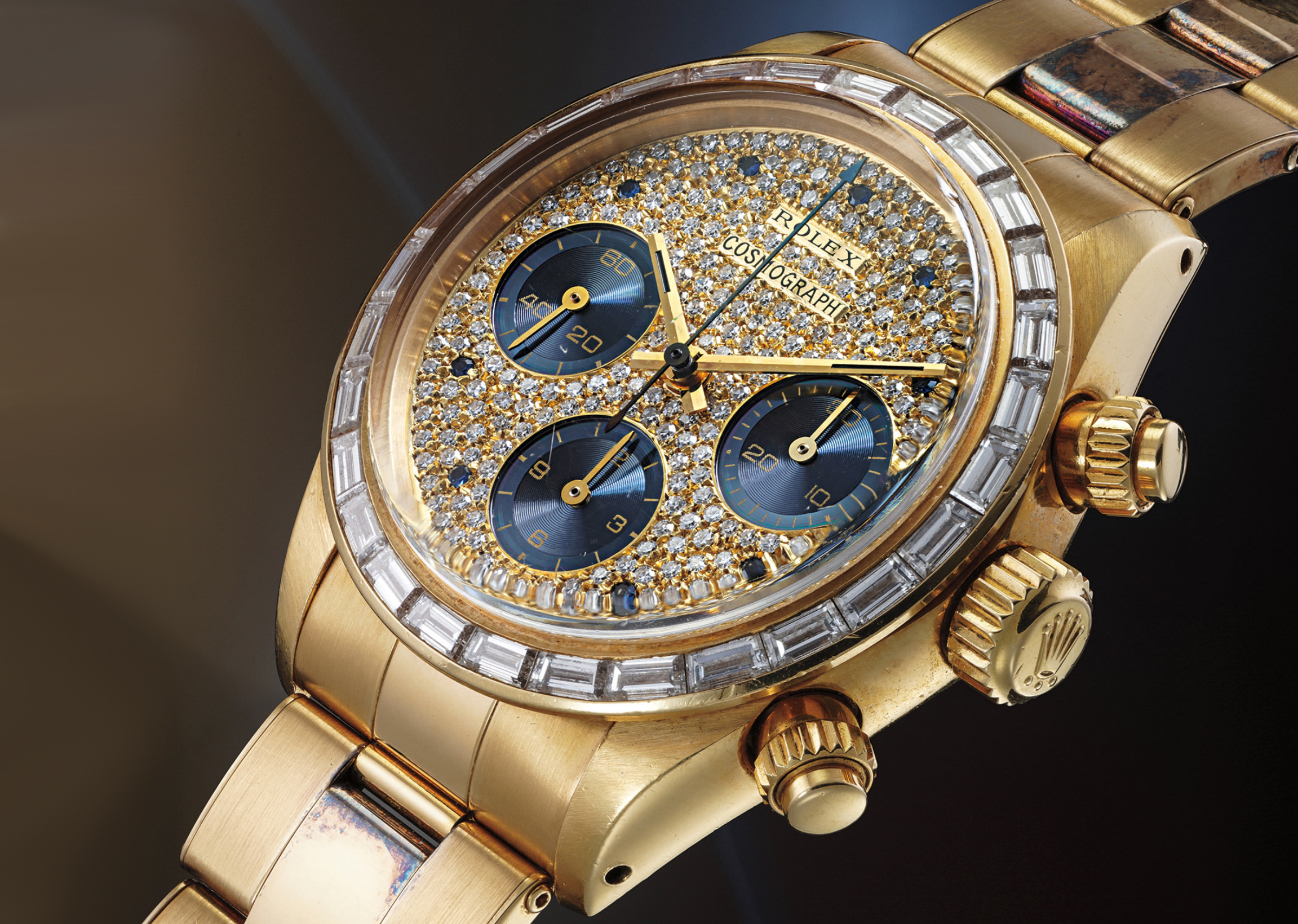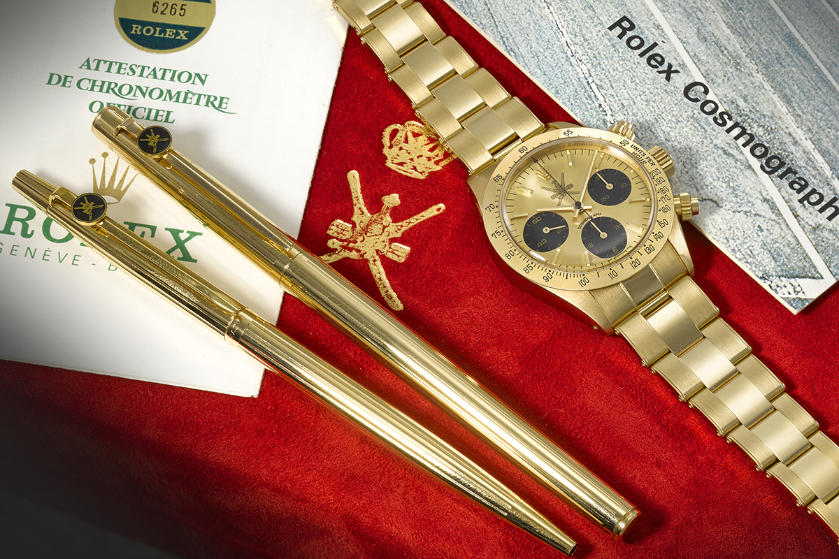 Naturalmente i riflettori si sono accesi anche su Rolex, grazie a un’ampia selezione di pezzi realizzati per il Sultanato dell’Oman, ben sette. Ha spiccato il raro cronografo Daytona Ref. 6269 con lunetta incastonata di diamanti e quadrante e bracciale tempestati di diamanti e zaffiri, realizzato intorno al 1985 e venduto per 1 milione e 134mila franchi. Anche tutti gli altri sei pezzi vintage e moderni, ordinati una volta da Sua Maestà Sultan Qaboos Bin Said Al Said, sultano dell’Oman, che recavano l’emblema di Khanjar o la firma del sovrano, sono stati venduti.