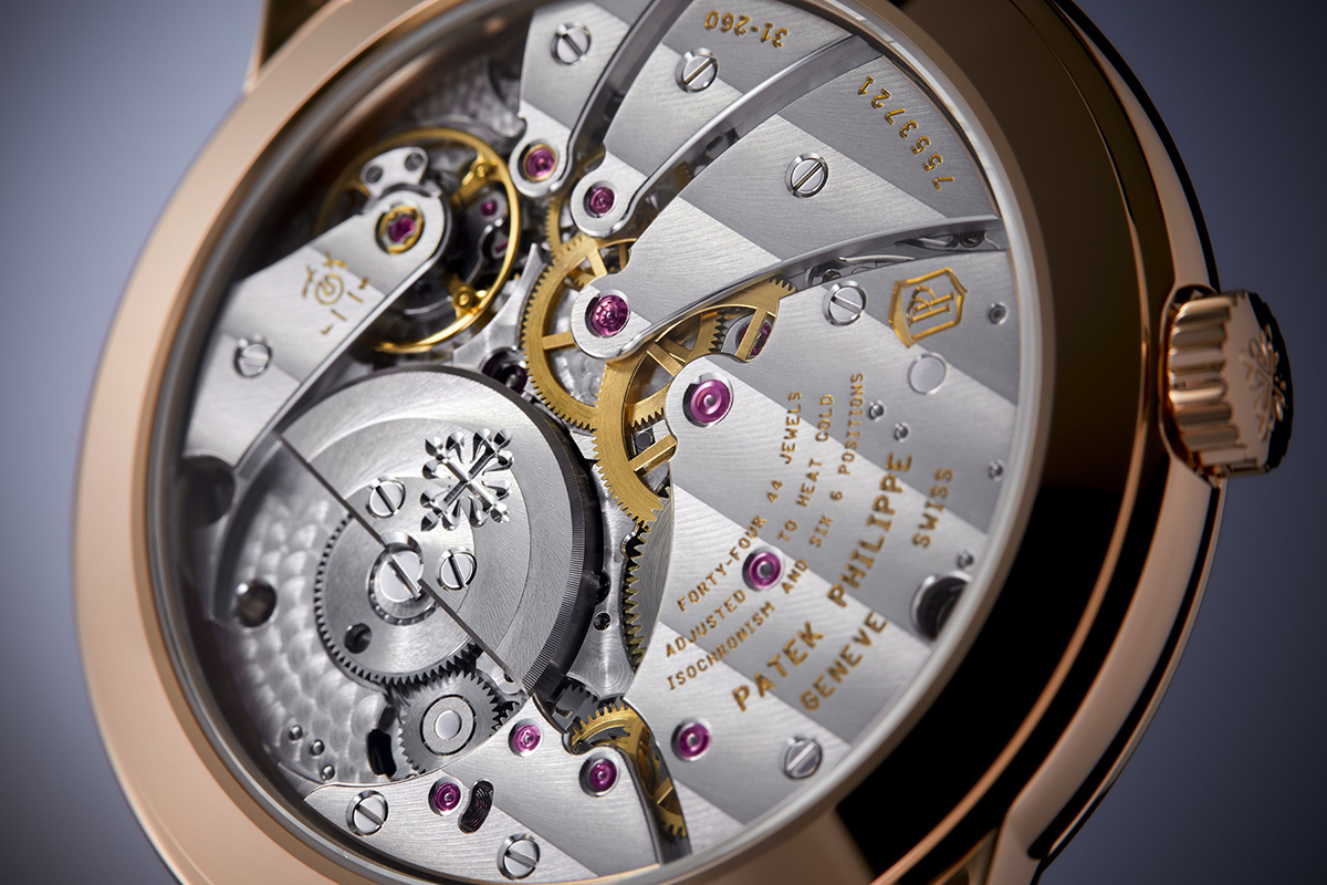 Patek ha dato a questo movimento di base una frequenza di 28.800 alternanze/ora e il 20% in più per la coppia bariletto-molla. È alimentato da un micro-rotore in platino, più pesante dell’oro – quindi con una migliore capacità di carica -, e ha una ruota di riduzione che disaccoppia il meccanismo di carica automatica quando si ricarica a mano l’orologio. In questo modo, si riduce l’usura dei componenti.