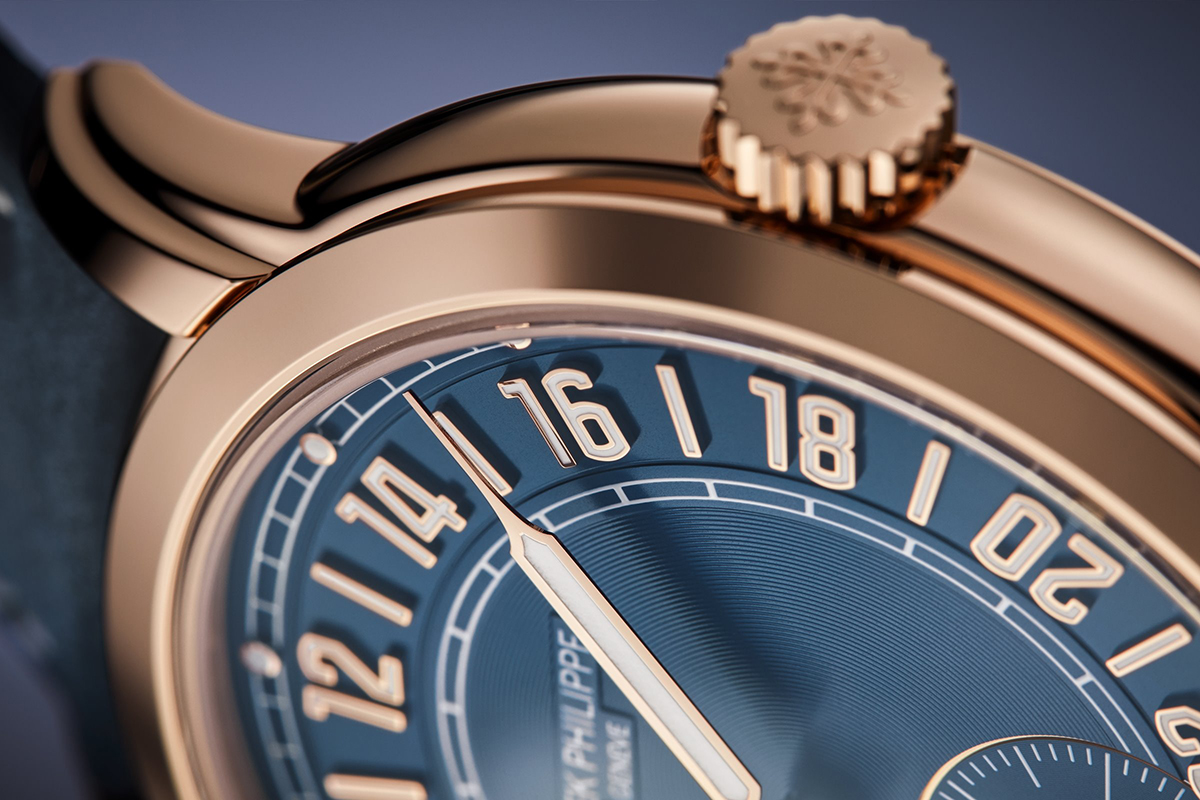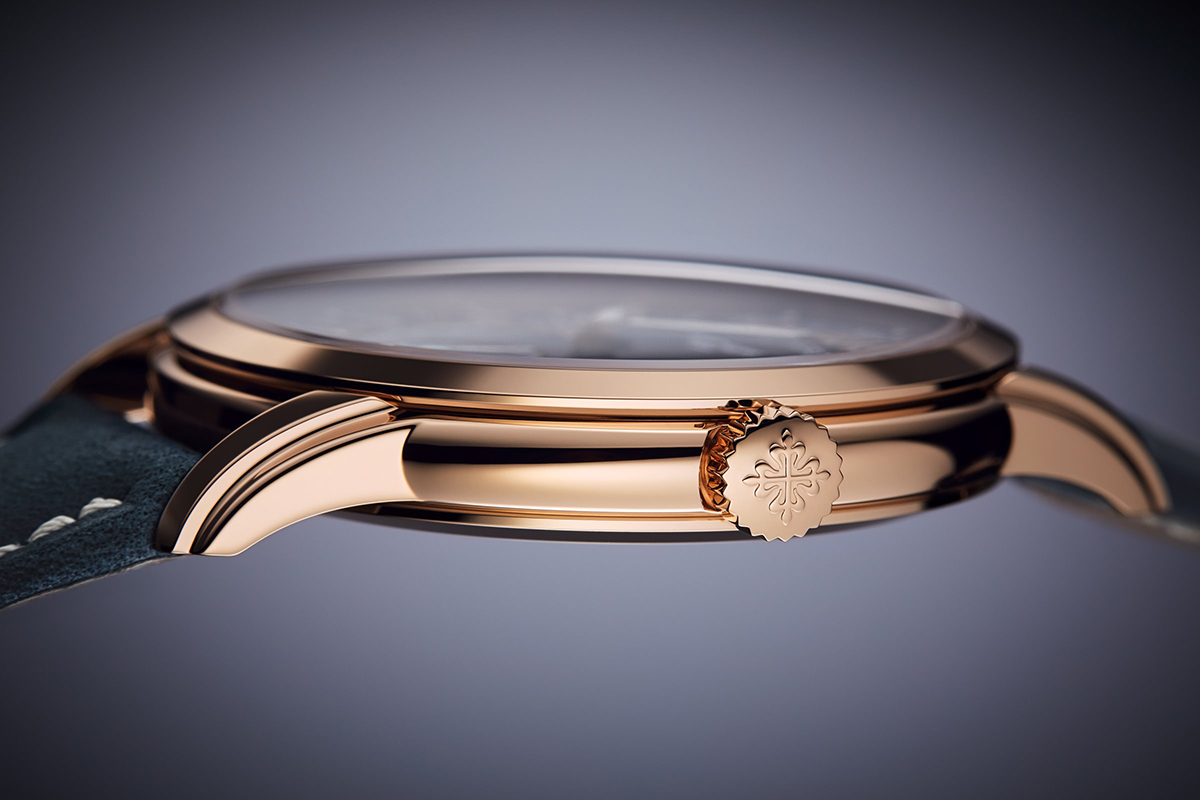 Grazie alla sua particolare architettura, il calibro 31-260 PS FUS 24H ha consentito a Patek Philippe di mantenere un design essenziale, eliminando i classici pulsanti correttori dell’ora locale posti sul fianco sinistro della carrure. Al loro posto c’è un sistema brevettato di correzione tramite la corona, estratta in posizione intermedia (correzione avanti e indietro con incrementi di un’ora). Un dispositivo che riprende quello utilizzato nel 2022 nella ref. 5326G-001.