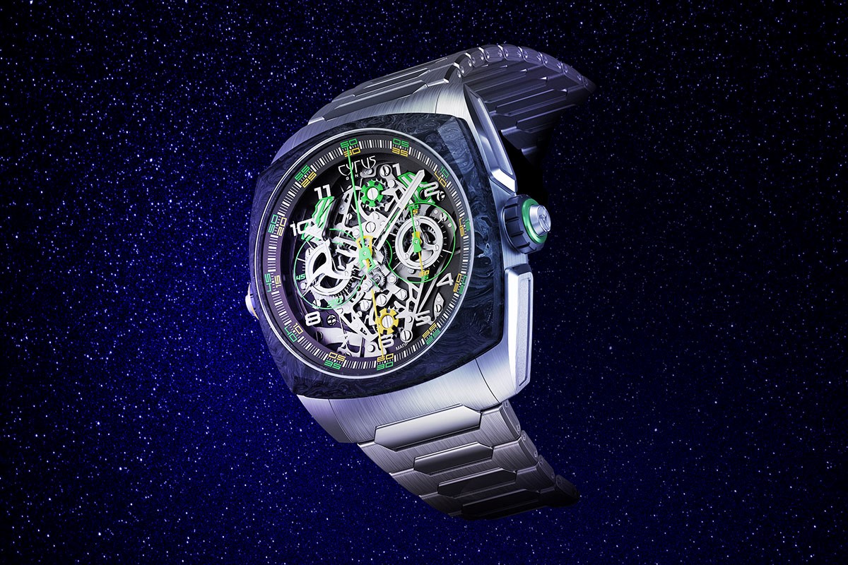 Cassa (42 mm) in titanio grado 5, impermeabile fino a 10 atm. Movimento meccanico a carica automatica, calibro CYR718 di manifattura, con doppio cronografo indipendente. Quadrante traforato, lancette, numeri e indici luminescenti, lunetta in carbonio con fibre luminescenti, vetro zaffiro, fondello con oblò in vetro zaffiro, bracciale in titanio grado 5. Edizione limitata di 50 esemplari, 50.300 euro.