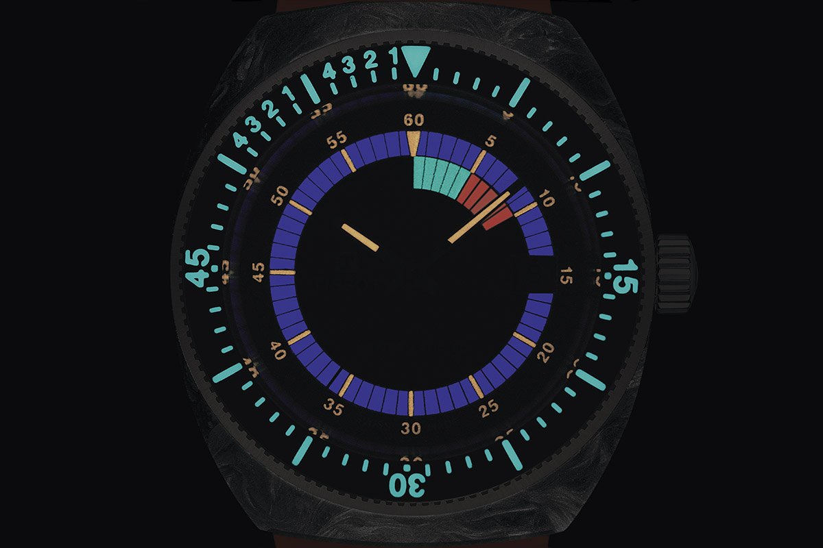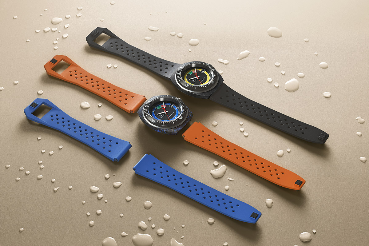 Poco sopra ho citato il cinturino in caucciù colorato. Disponibile rosso, giallo o blu, in quest’ultima cromia richiama il colore dei pigmenti presenti nel carbonio della cassa. Quello giallo, invece, rimanda direttamente al progenitore degli anni ’70 anche nella chiusura. Di fatto senza fibbia, si affida a un piccolo bottone a incastro che sfrutta la traforatura lungo l’intero cinturino.