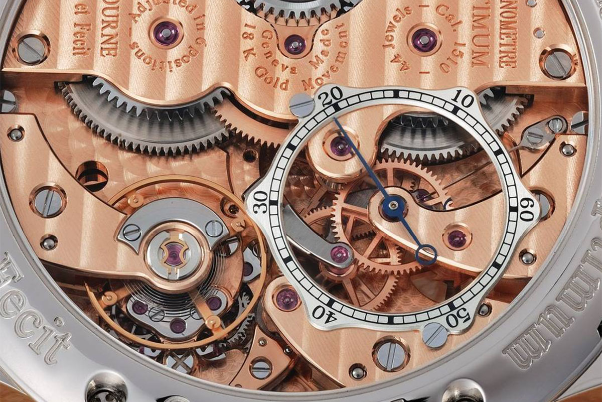 Lo scappamento bi-assiale ad alte performance, che in lingua francese porta all’acronimo Ebhp, è un altro brevetto Journe, nonché un altro passo verso quella perfezione cronometrica, o meglio, quell’Optimum che ha guidato l’intero progetto. Si tratta di uno scappamento a impulsi diretti: ciò significa che le ruote trasmettono i loro impulsi direttamente all’asse del bilanciere evitando le possibili imprecisioni date da un doppio impulso – come accade ad esempio in uno scappamento ad àncora.