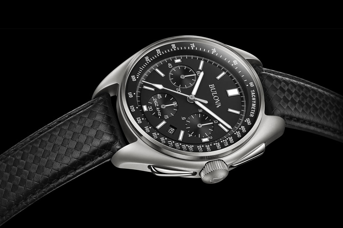 Il movimento non è quello originale e non è neppure meccanico. È il quarzo ad alta frequenza (262 KHz) introdotto nel 2010, capace di misurare i decimi di secondo e forte di una precisione di 10 secondi all’anno. Ne abbiamo recentemente tratteggiato la storia parlando dei nuovi modelli di Bulova Curv.
