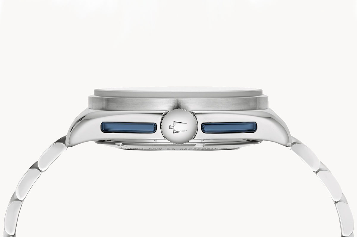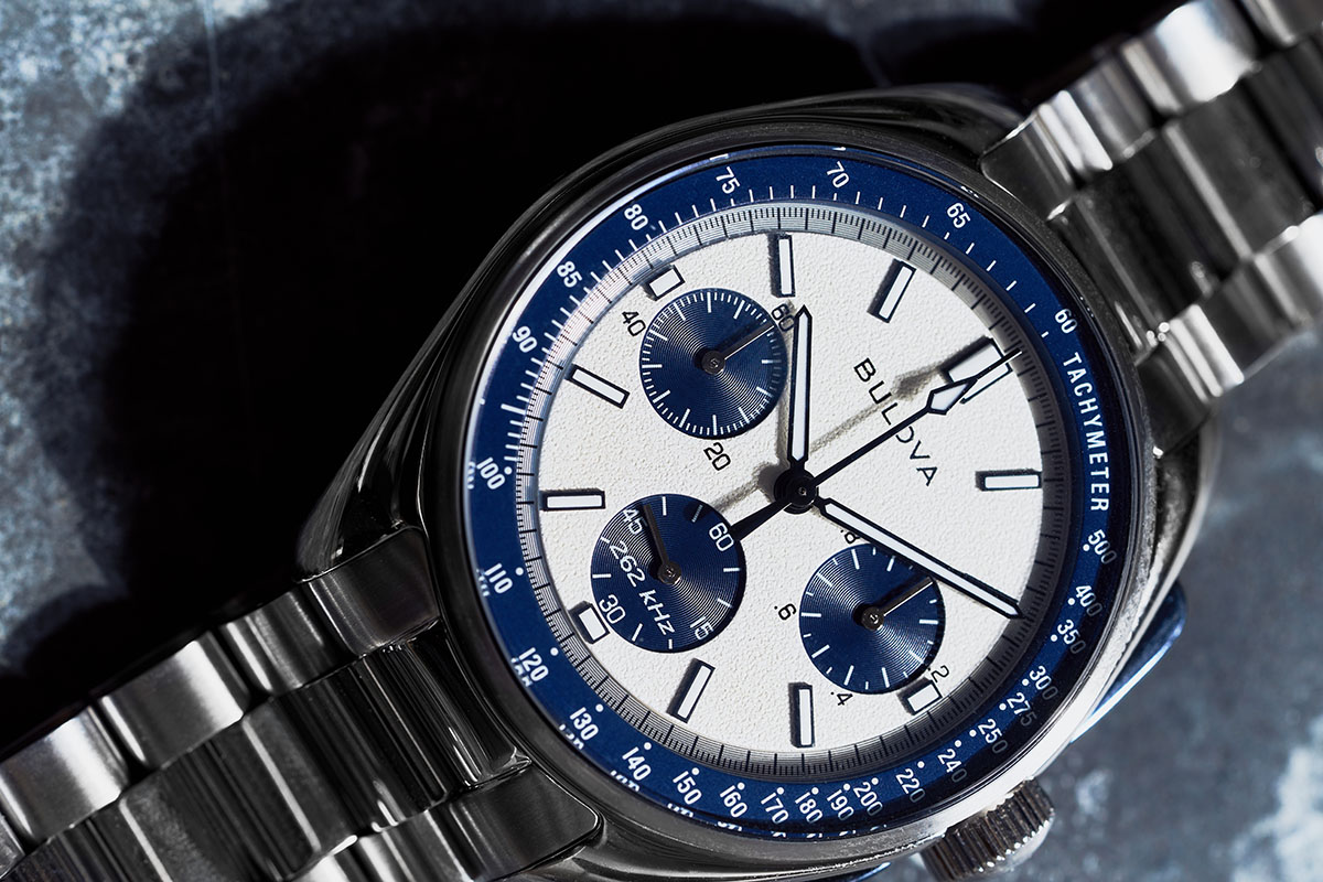 Ed eccoci finalmente al motivo per cui abbiamo ripercorso dall’inizio questa storia. Nel febbraio di quest’anno Bulova presenta due nuovi Lunar Pilot che arrivano in distribuzione nei negozi proprio per l’estate e vanno subito esauriti. Leggermente rivisti, riprendono esattamente il diametro del crono del 1971: 43,3 mm. Per la prima volta, con la referenza 98A305 Bulova introduce anche un quadrante “panda blu”, ovvero bicolore con fondo chiaro e totalizzatori blu, così come i pulsanti crono ad aletta.